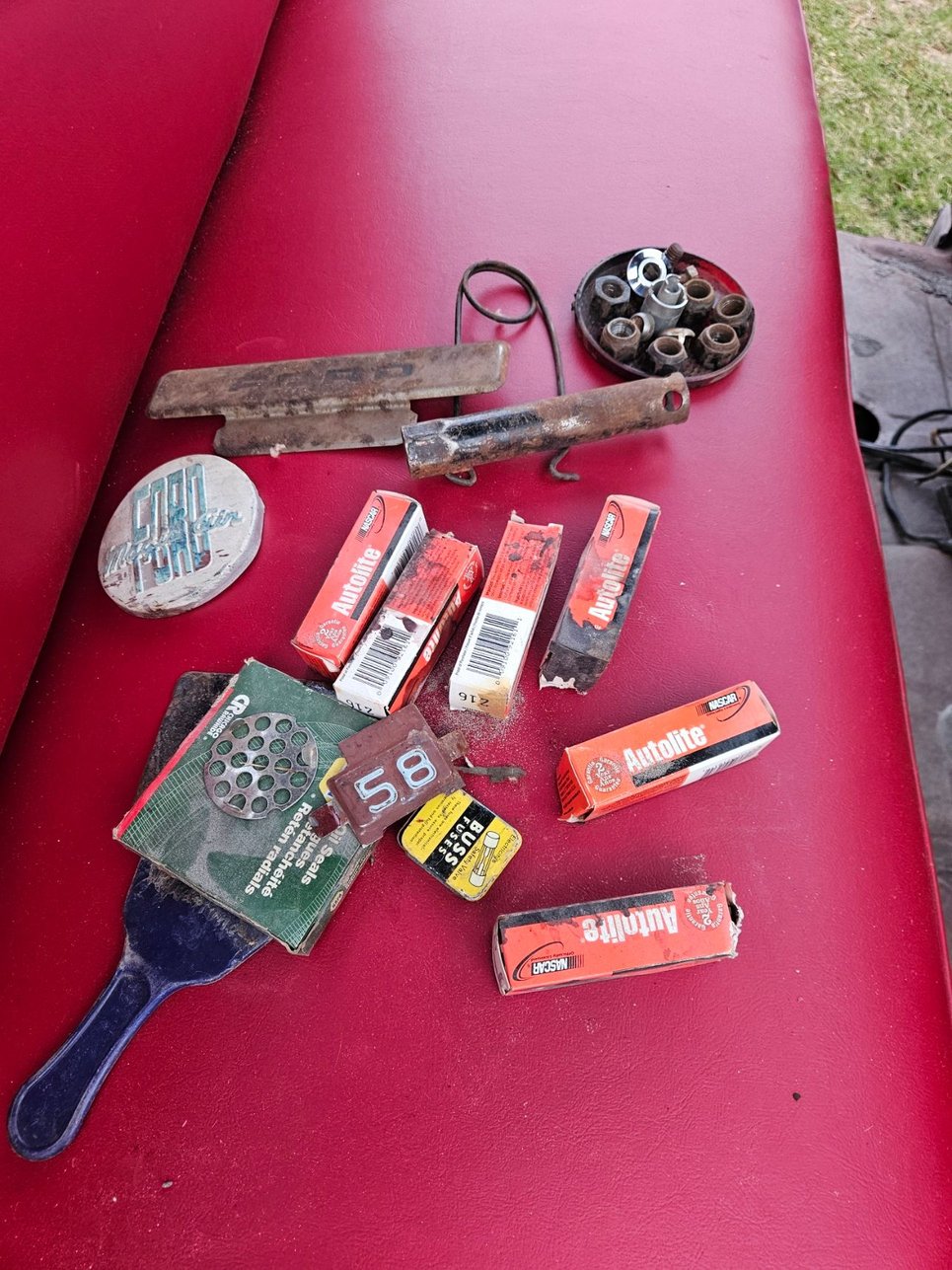 I have been finding "artifacts" in the glove box and tub of parts as well. Can anyone identify the 4 pieces in the one pic attached?