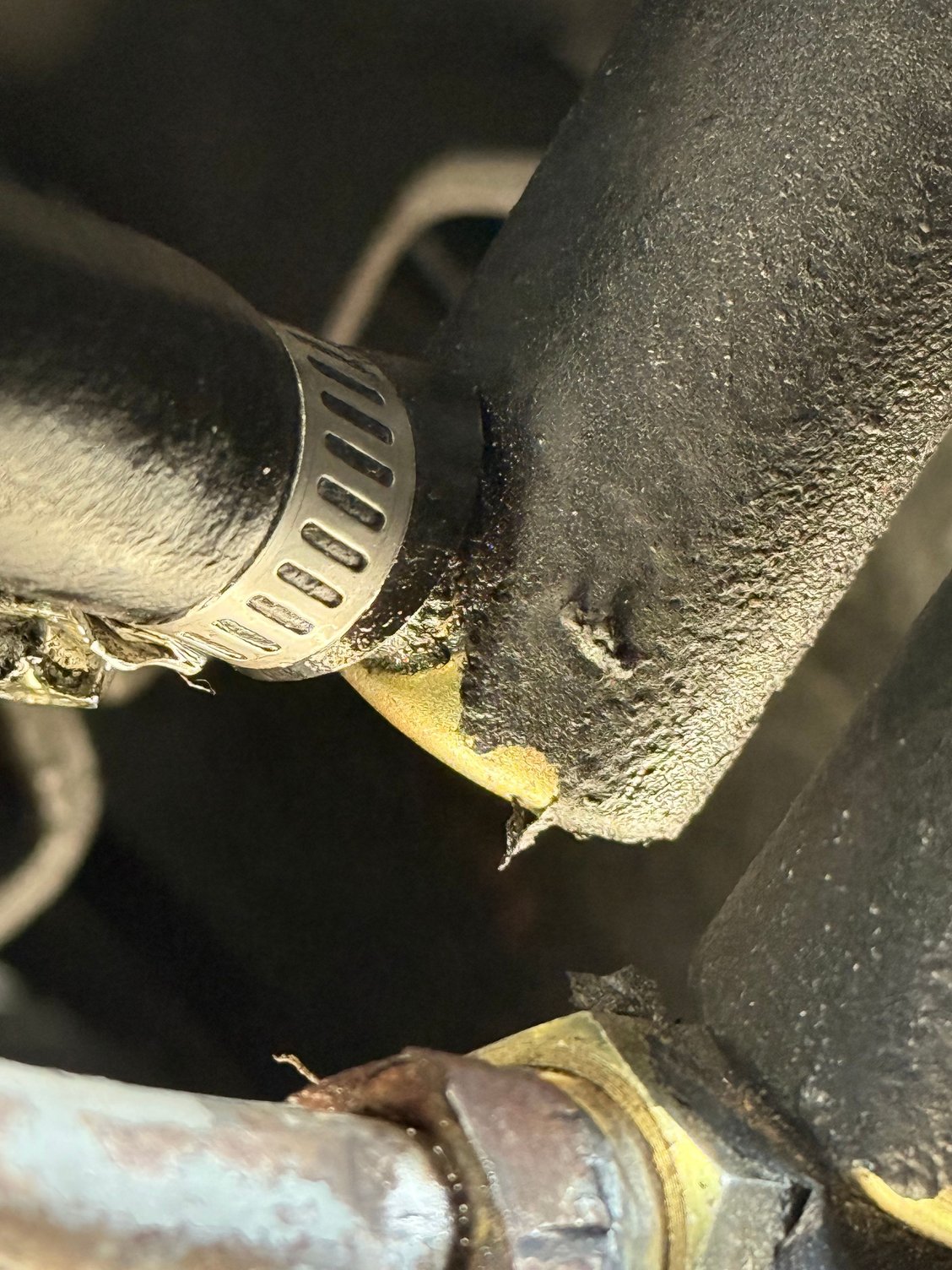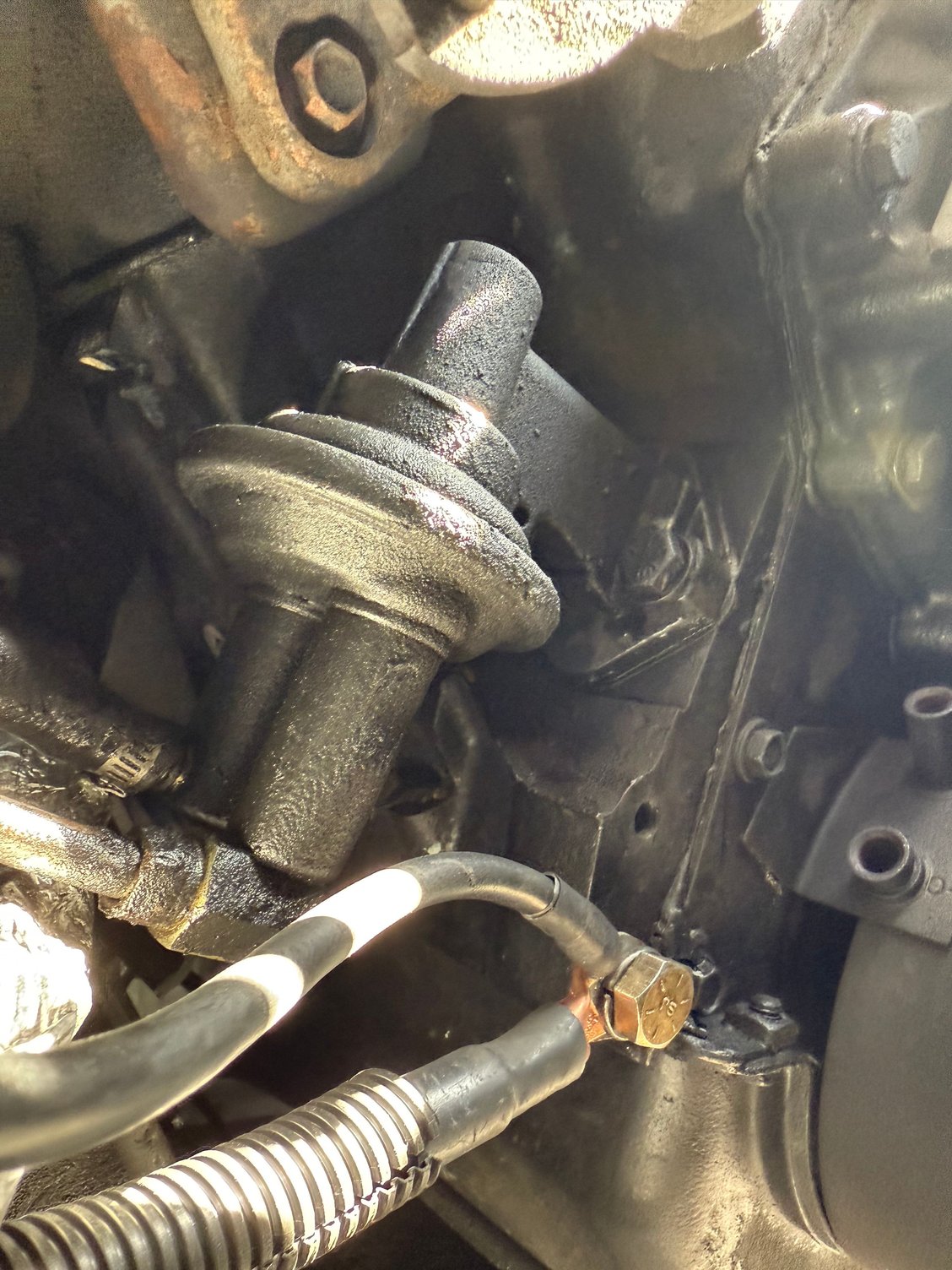 Amazing how the radiator can blow a leak at the front of the engine to make it come out the back lol. Anyway, the leak if pretty big coming from either this steel line or the hose connected to this…thing.