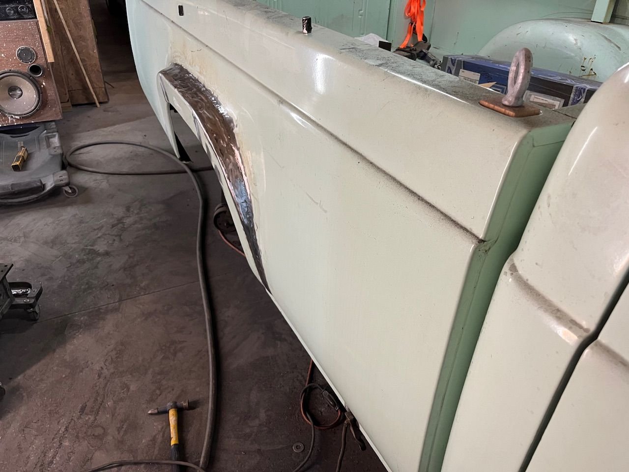 since I was rotating the arch outward I was also changing the angle where I made the cut. I had to tip the cut edges up on the bed and down on the arch. After that the arch needed a little shrinking to keep its shape before going back on. Final pick is with the weld all ground down. It has some distortion from the MIG but not visible by pictures. Will smooth out easily with a skim coat of mud.