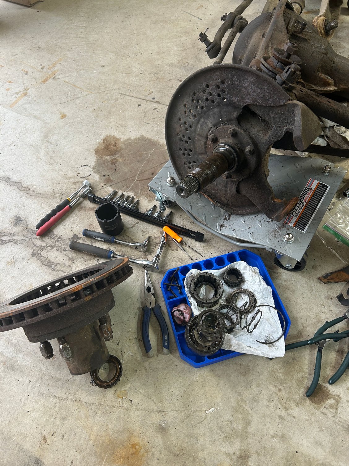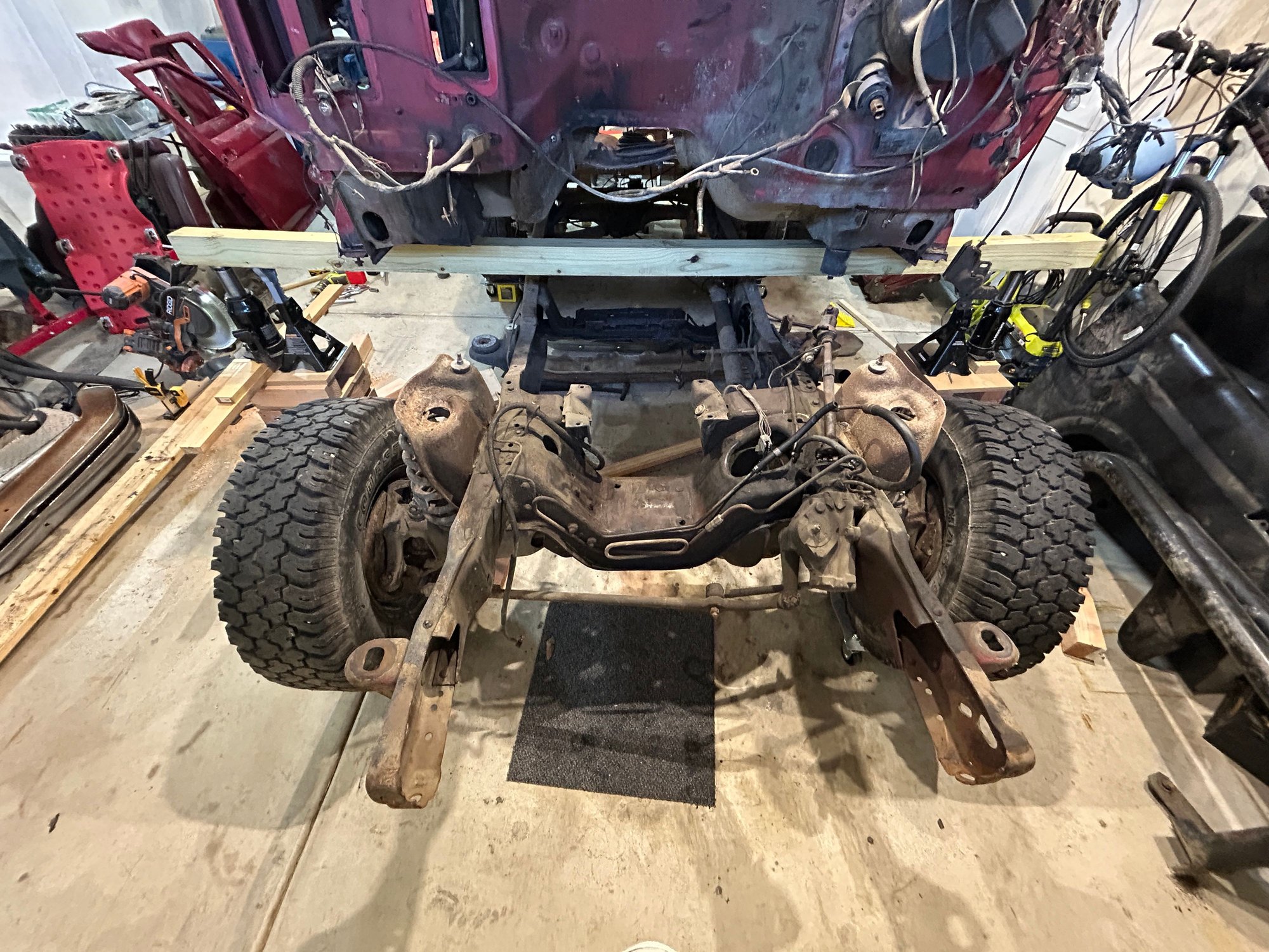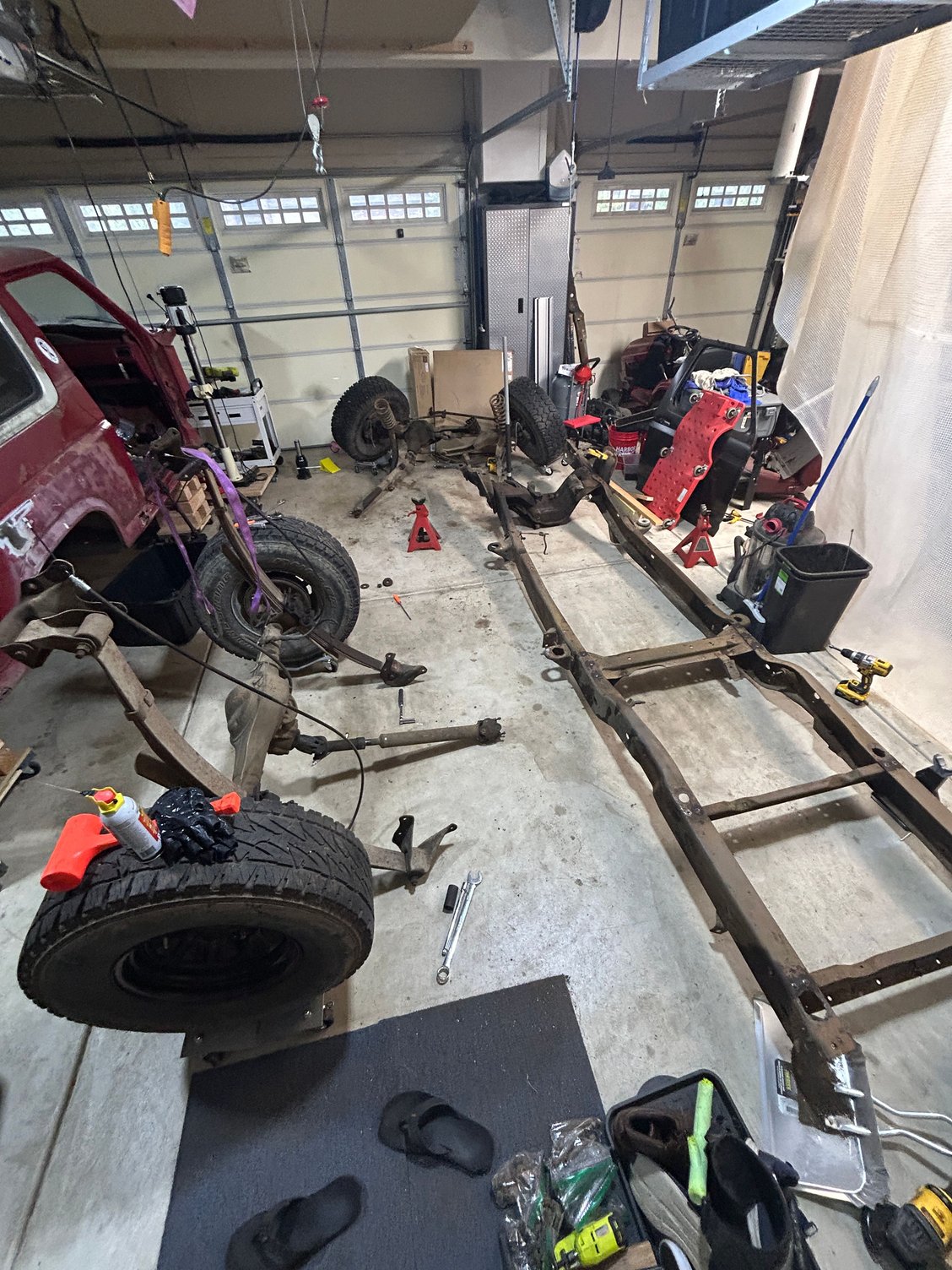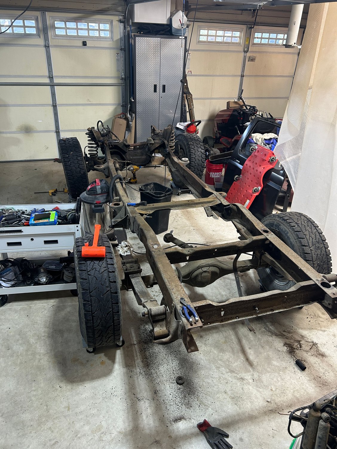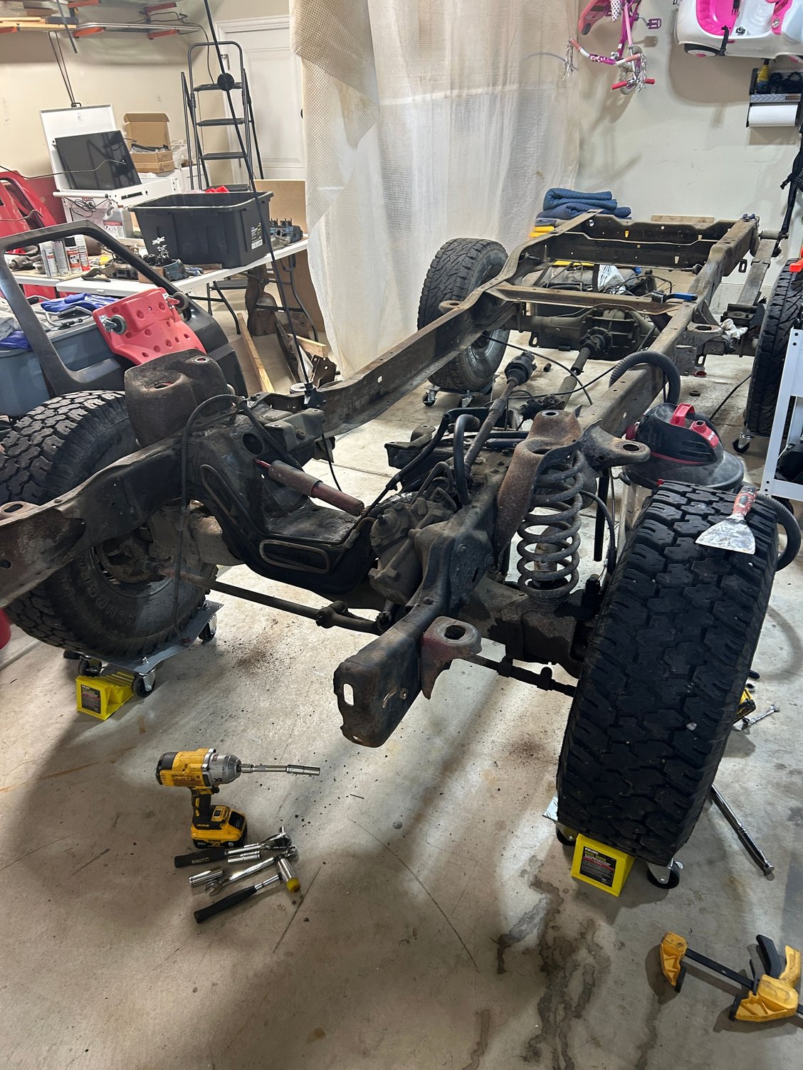 In the slow and painful process of using PB Blaster and trying to get the cross members and remaining suspension bolts take off so I can get the axles separated from the frame. I had intended on not going too crazy with the removal over every component, but I think I am going to remove every rivet and replace with bolts because there is a bunch of trapped rust between the various components. Not sure what the best way to approach it is going to be, but I will probably use a combination of drill / grinder and chisel to get all these old rivets off. Half are questionable anyway and since im going this far, better just do it all.