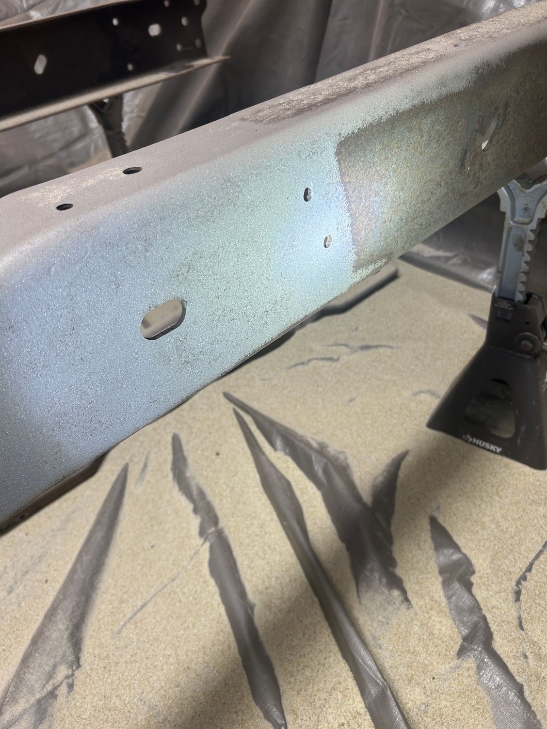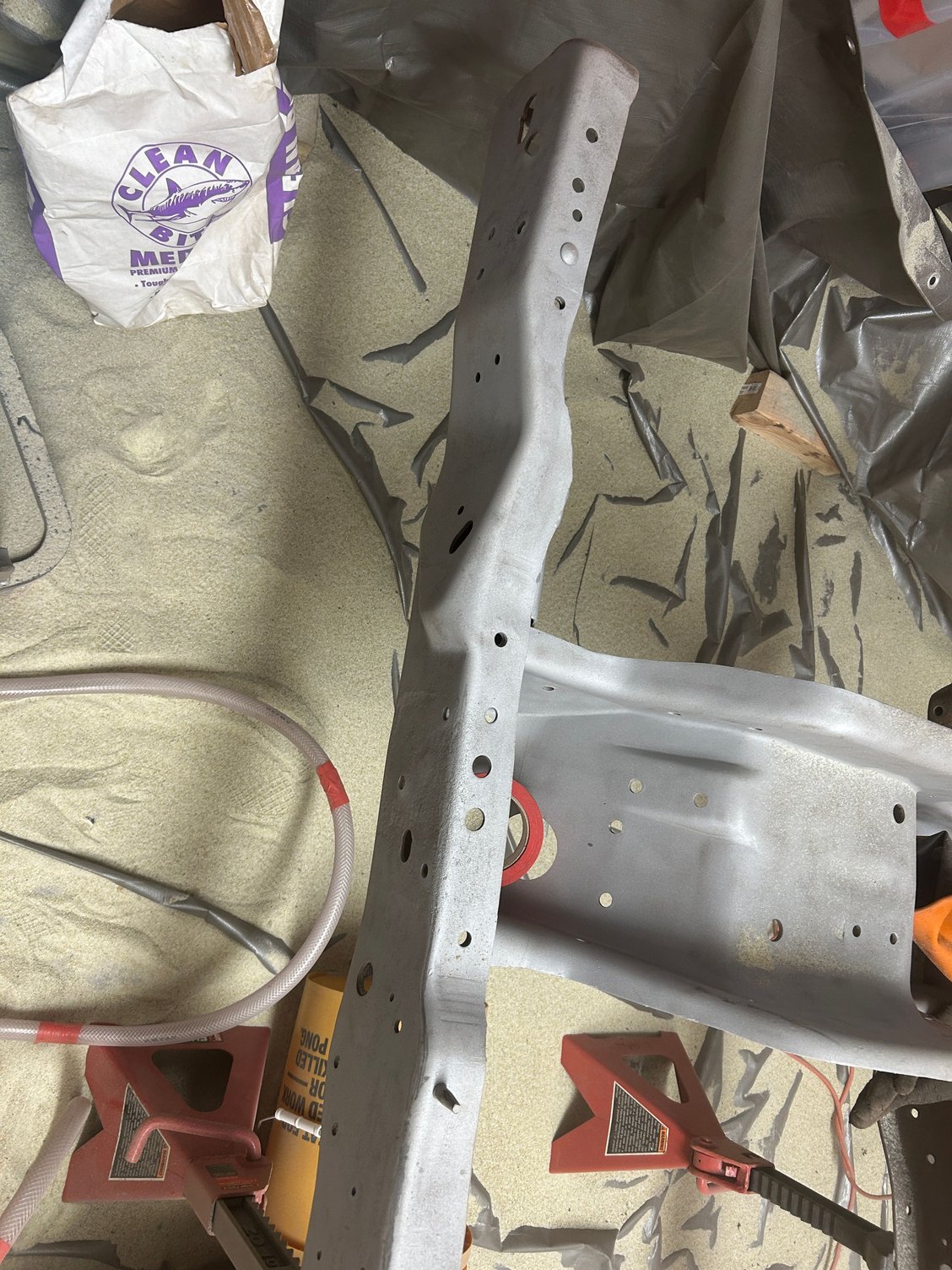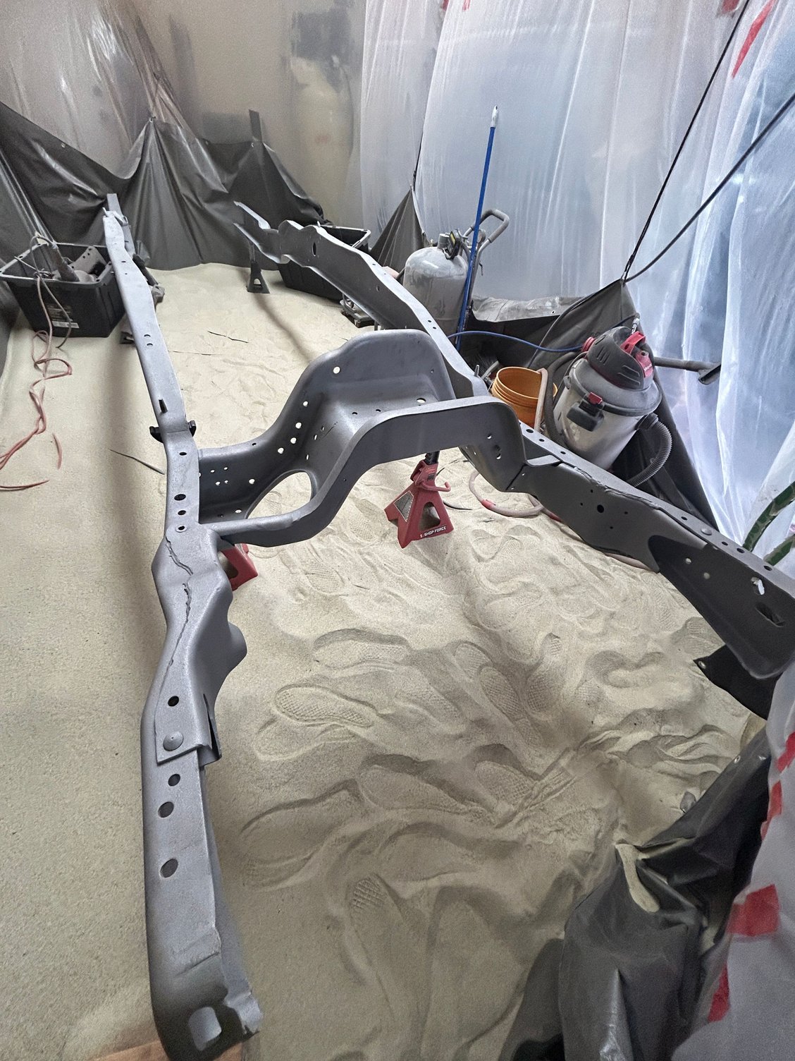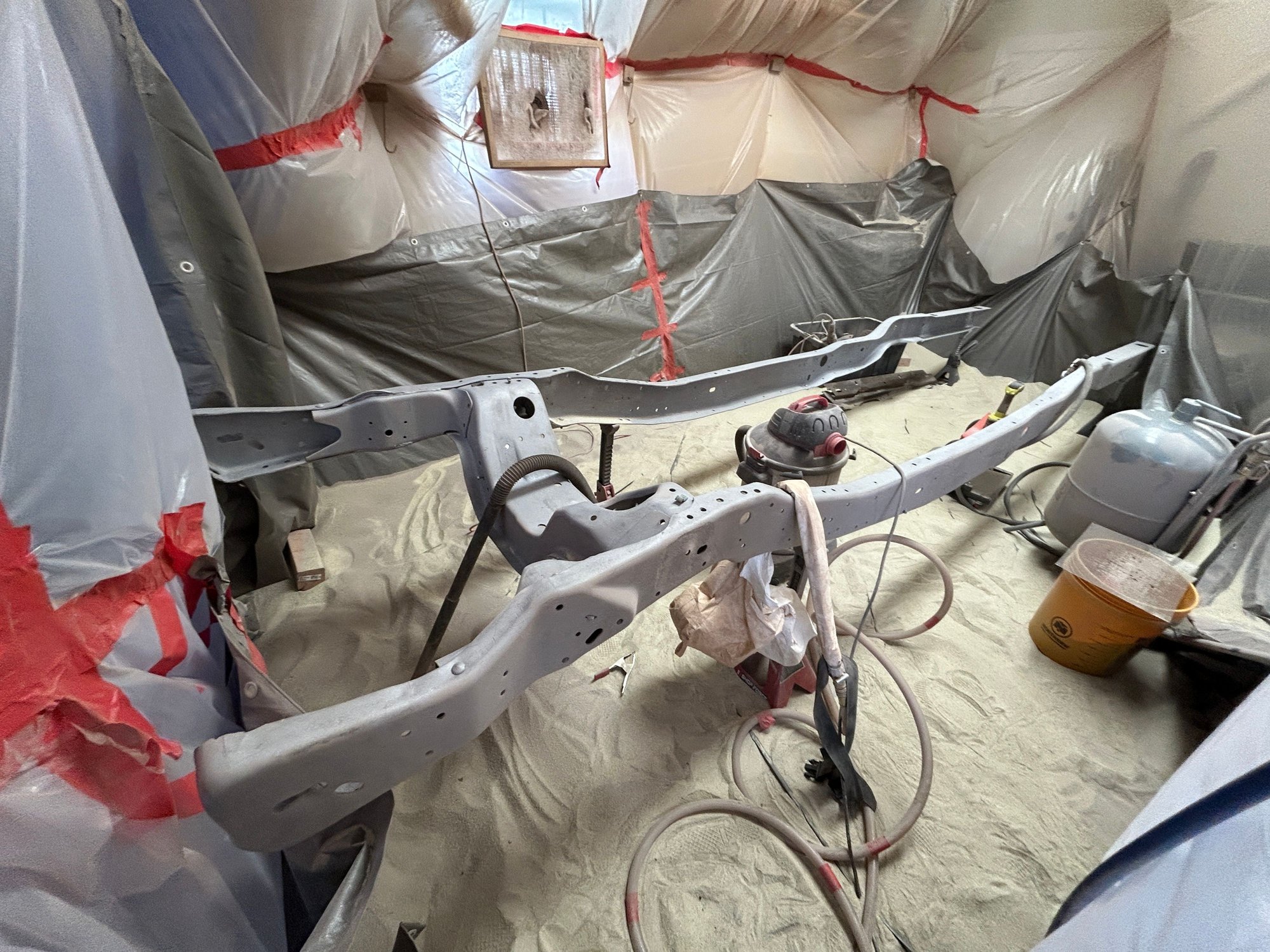 Sandblasting took 1200lbs of media to do the frame. Recycled glass media was amazing. I also got the upgraded nozzle off of eBay that everyone buys because the deadman nozzle from Harbor Freight is terrible. My 5HP compressor kept up just enough. I had a harder time with the air filter in my containment getting clogged and then not pulling enough air. I would periodically stop and HEPA vac it off to get more airflow, but it started to become a pain. Not sure I want to try and do the body myself... It will probably take another 1200 to do the suspension, axles, and various brackets. I plan on recycling the media for this and then likely throwing it away. Not sure if the body is going to be worth saving at this point. Have found some decent ones down in Texas for around $2000 and would just have to ship one up here. Still debating. Plan for the winter is to sandblast the remainder of the frame components and paint and get back to a rolling chassis.