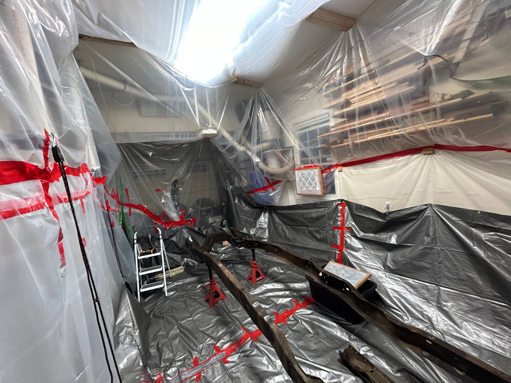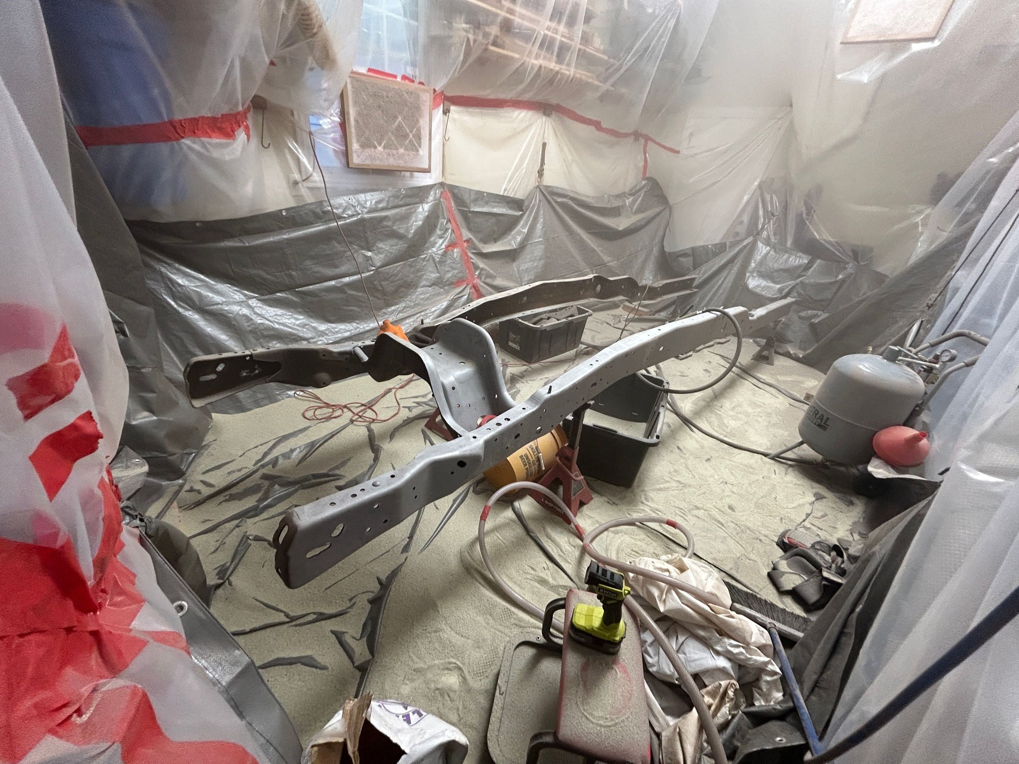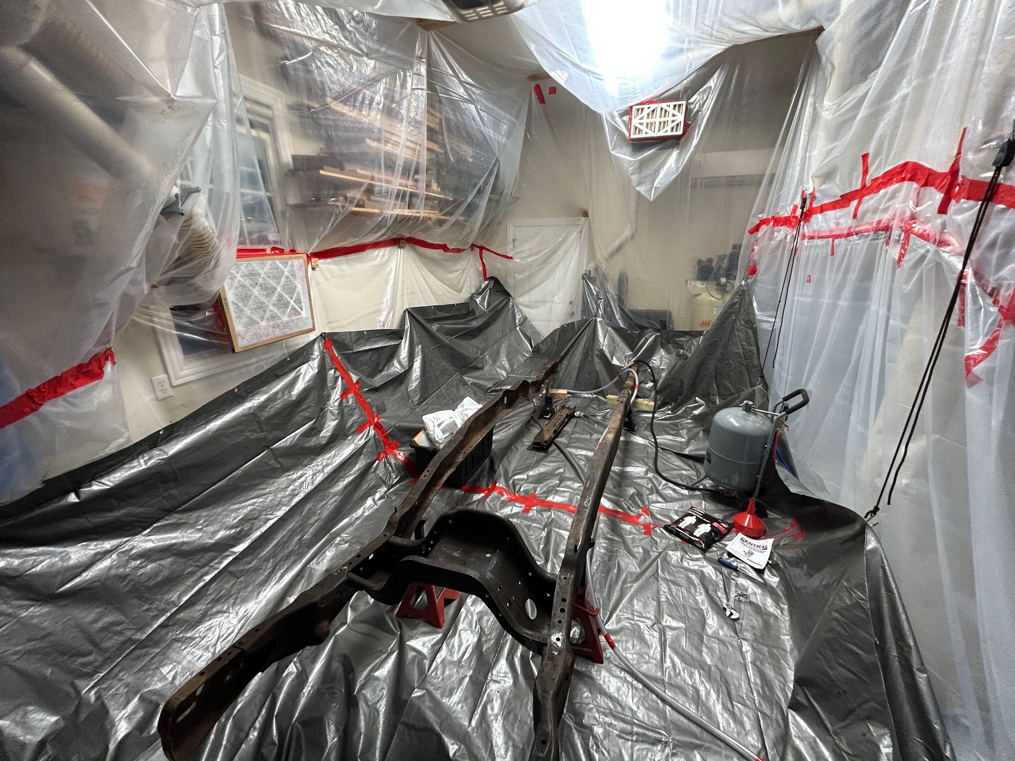 I was also able to get a good start on my sandblasting containment. I used 4mil poly sheeting to create a containment and then will drape two tarps inside to hopefully keep the containment in tact and also catch as much blast media as possible to be reused. I have to box fans sandwiched with a large HEPA filter in the garage window and also another HEPA filter at the ceiling (used to be a woodworking dust filter). This will put negative pressure in the containment and hopefully clear the air to some degree so I can see what I am doing in there. Will be using a full face respirator and if need be, will use a surface conditioner tool for the larger areas. I will then coat with Eastwood Optiflow Epoxy primer and then most likely some sort of chasis paint.
