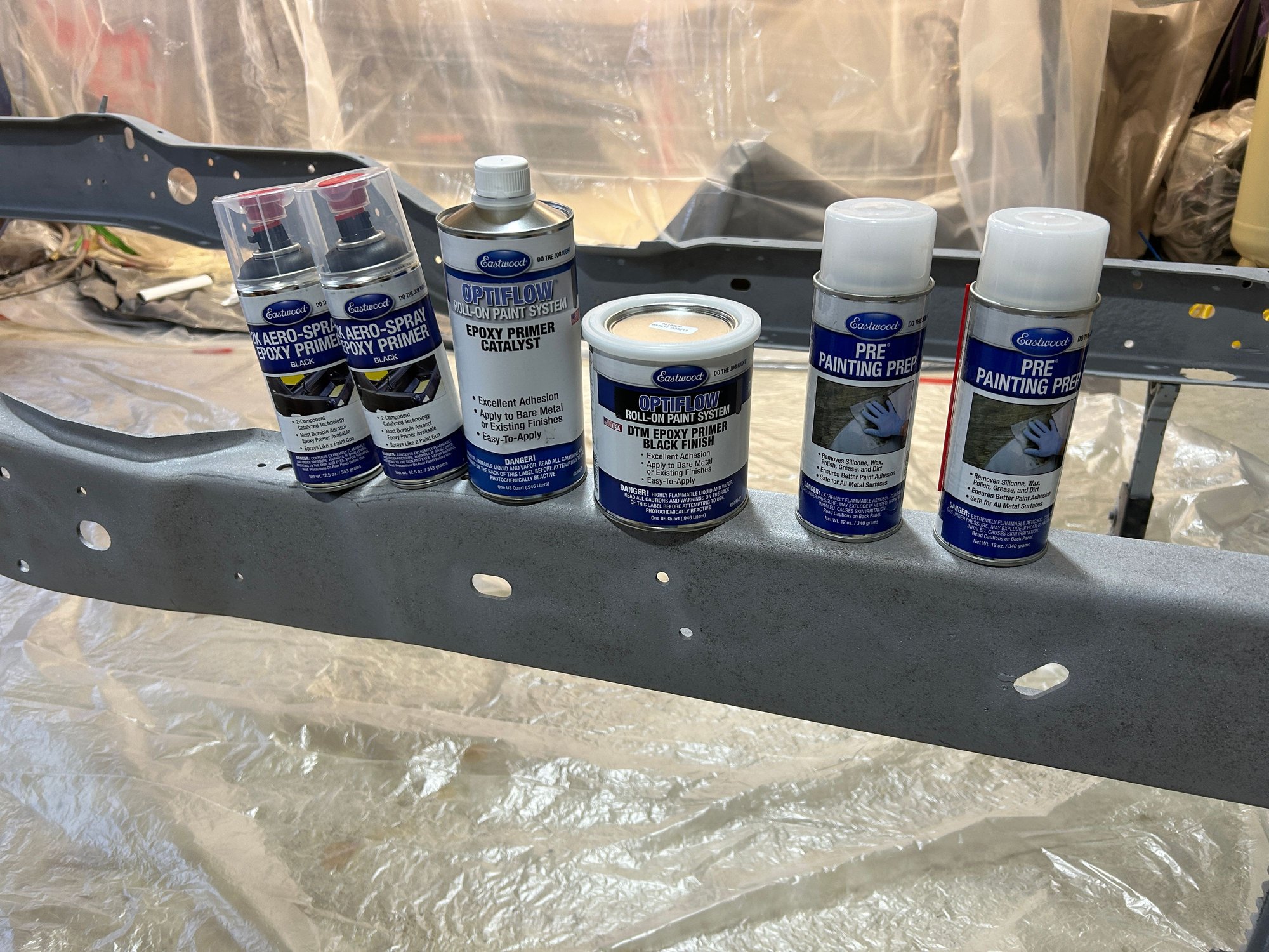 The Optiflow epoxy primer roll on worked well. Had to get the garage heater going because it was not curing. After I applied everywhere that I could roll it on, I used (or tried to) one can of the 2k rattle can...no idea what the issue was, but I followed the directions exactly. As I started pressing the nozzle, I would get some product, but not an even spray. I was also noticing paint coming from the top of the can under the nozzle. Things only got worse as I tried to hit the areas the roller could not reach. The leaking can got worse and the cold product about gave me frostbite by the time I was done. More paint came out of the top of the can and dripped everywhere and on the frame in a couple spots. I am going to ask for a refund. I had high hopes for the can, but this was a joke. Pics for reference. I was mainly concerned about getting the bare metal protected, and when I get everything else sandblasted and primed, then I will paint them all with chassis black to finish.