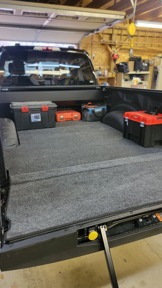 Got all my "winter gear" in the bed. Duluth Trading jacket & pants, gloves, hats, etc, my recovery kit to help others (recovery strap, tow strap, D-rings, jumper cables, etc), Weigh-Safe hitch kit, and my box that houses diesel additive, tools, impact gun, impact sockets for all sizes of lug nuts, etc.). Under the back seat is a 12V air compressor, tire repair kit, battery for impact gun, and a few other winter needs.