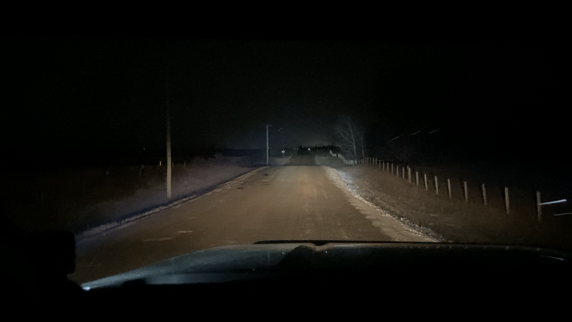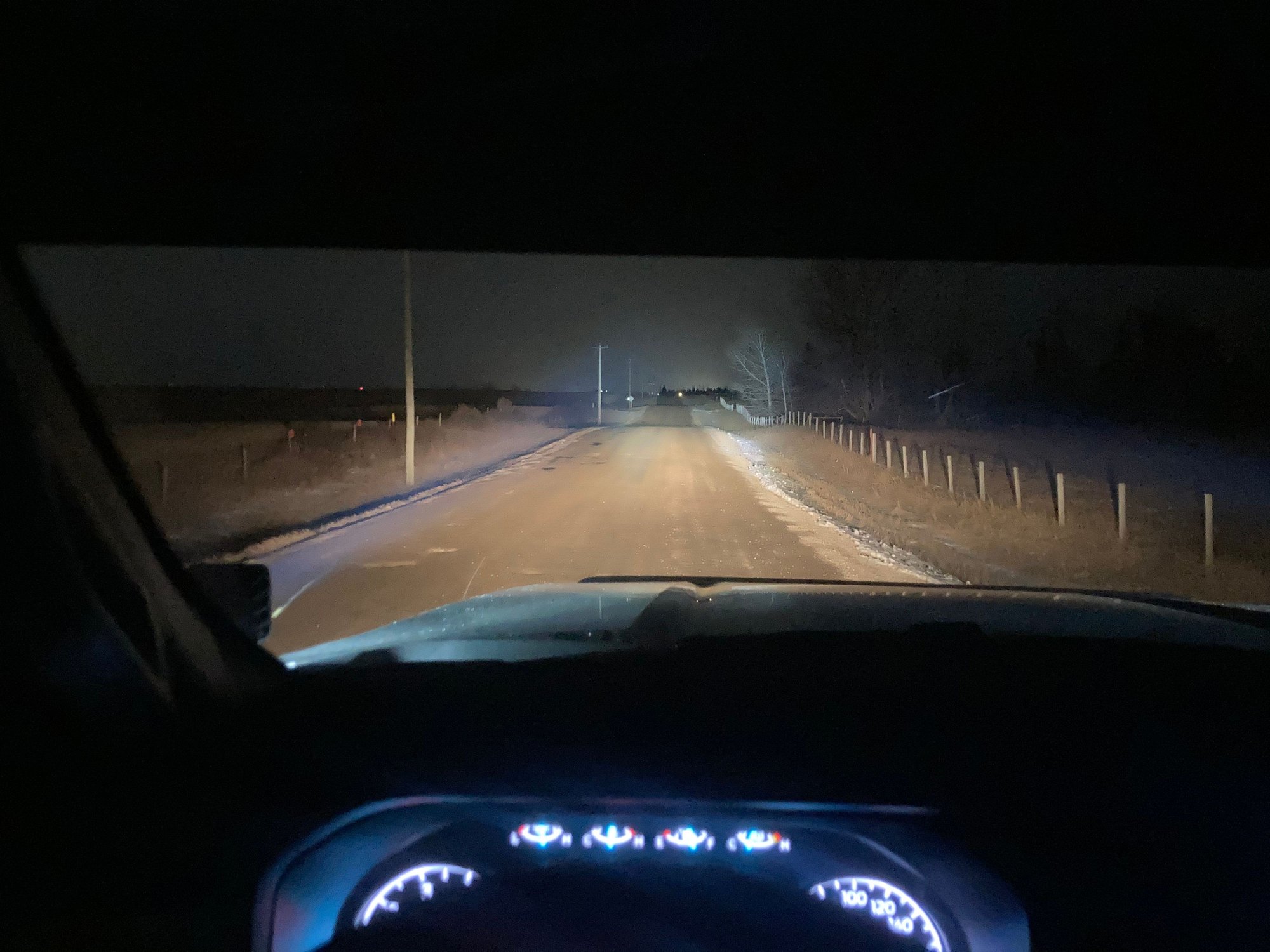 pics above don't show well as they are screen snapped from video, there's 3 humps along the road, low beam doesn't crest first one, high beams shows the next one, the ditch lights takes the 3rd one and it's ditches where i aimed them for wildlife at speed, will add another pic see if it shows that better, easier to see zooming on my phone, its so far you need the magnification to see how much is actually being lit up down there lol...one more pic below was an actual pic i took with everything on (not a screen snap from video), click on it and then zoom in, you nearly need bino's to see how far these puppies get lol, i just google mapped that spot and measured distance to that far sign end of 3rd hump and it's 610 m or 667 yards