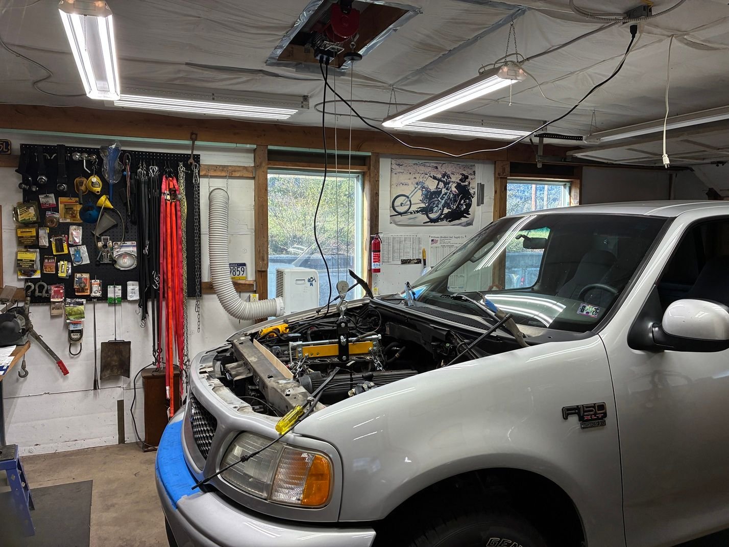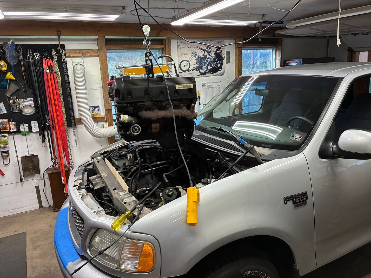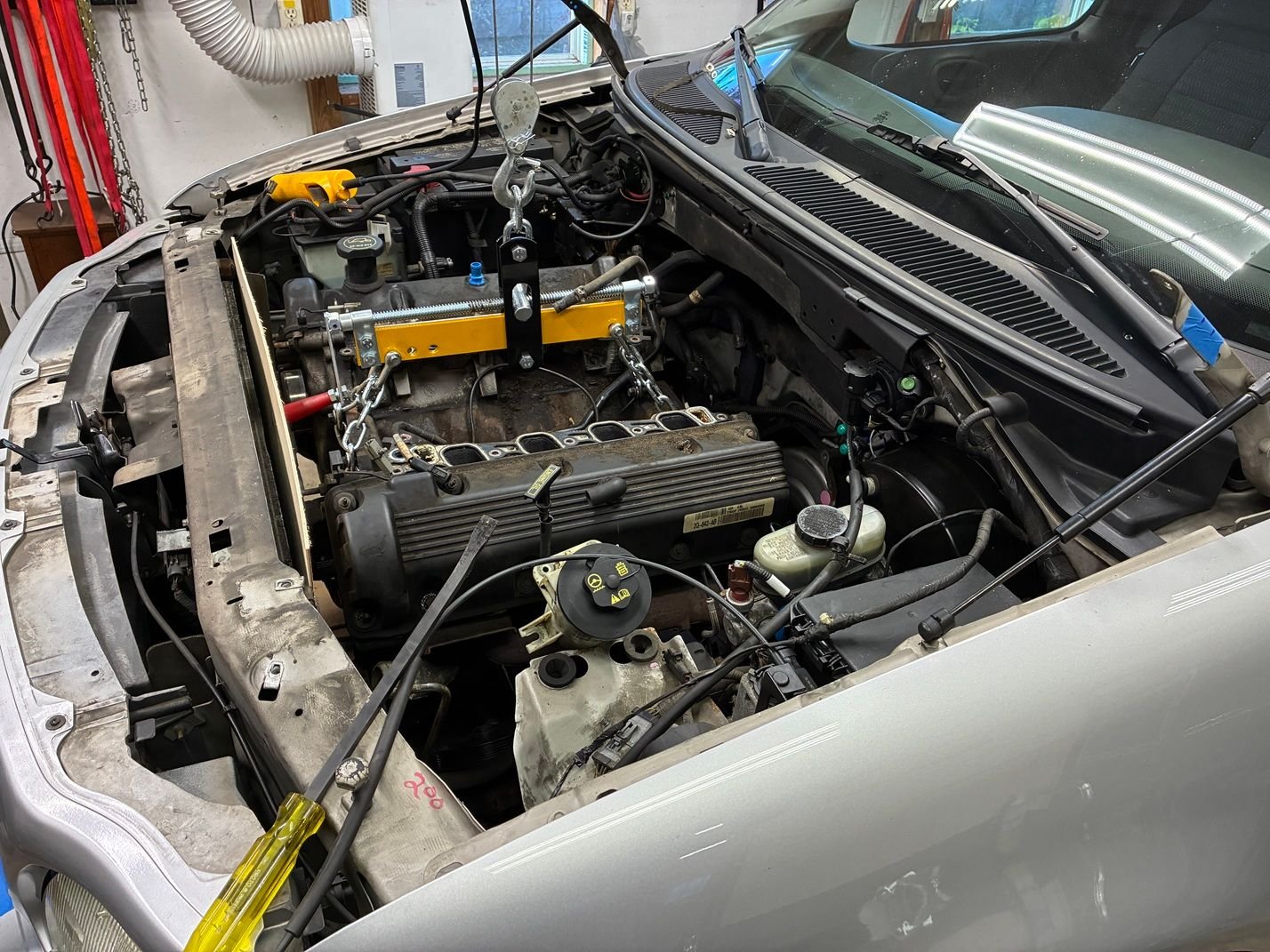 The big issue is the back third of the engine being under the cowl. My harbor freight "shop crane" that I've had since the late 90's wasn't usable for this job because it just didn't have enough reach. I briefly considered removing the bumper and grill to get it closer, but decided to go with a hoist in the ceiling.