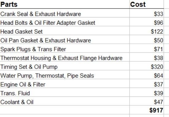 Here's the total cost for everything, which includes any shipping and sales tax, so actual total cost. And I went with Felpro and Melling for most the major items. And since you have to pull the transmission dipstick tube and loose fluid, I did the trans. service while I was at it.