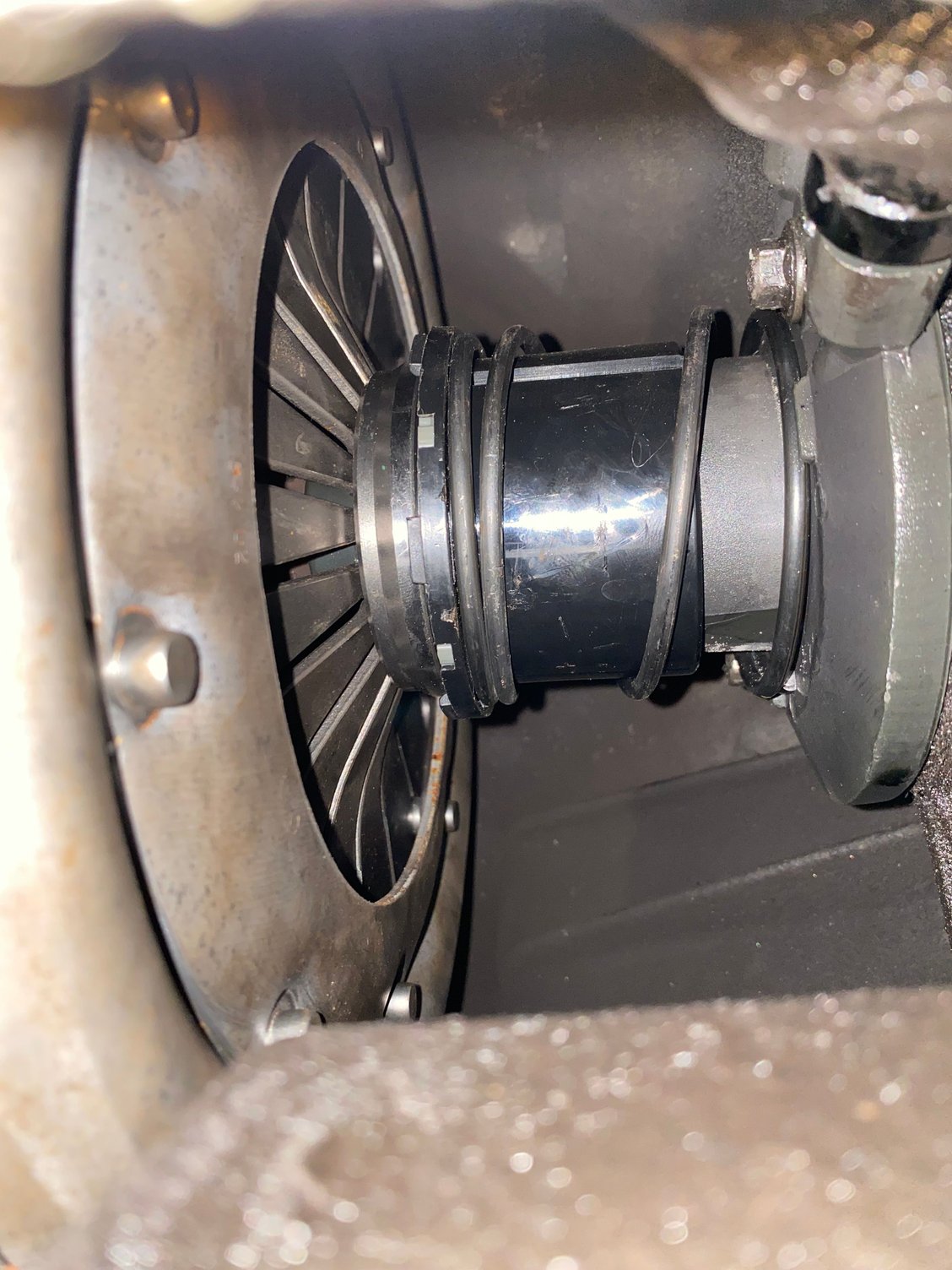The truck will move forward as if the clutch is not pushed when I turn the key in gear. We tried power braking and starting in gear a couple times treating it like the clutch plate and flywheel were stuck together. I had suspected and was going to swap the pilot bearing on the last trans pull but got talked out of it. The spline doesn’t have any marks or anything to indicate it’s grabbing.