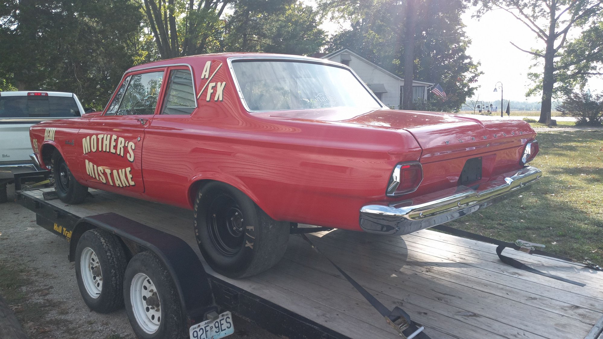 I get to work on some stuff that's pretty cool from time to time and last week one of my customers stopped by with the 1965 Plymouth factory race car that he and his brother have restored. I did block and cylinder head work on the engine. The car was bought new by a friend of their uncle when he was 16 years old and wanted to get into drag racing. His mother signed the papers hence the name, "Mother's Mistake". He raced it for a couple of years and then it got sold down the road.