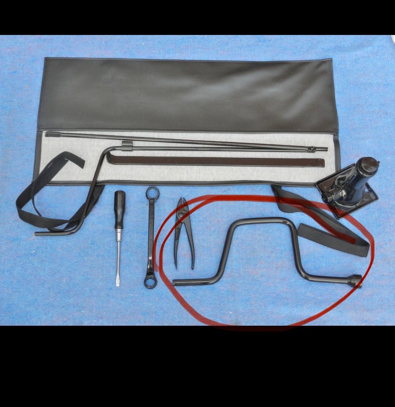 short answer; the tools came in a vinyl tool bag seen reproduced in said pictures , according to Lin’s specifications from Ford. They were then I assume placed in the tool tray at least for the Ford Trucks. Not sure what the cars did. The vinyl pouches did come in a few colors as they were made from scraps of leftover material from seat material. The most common I believe was black but Lin also told me about documented examples of brown and burgundy. One of the tool kits I had him make me was specifically a brown vinyl pouch.