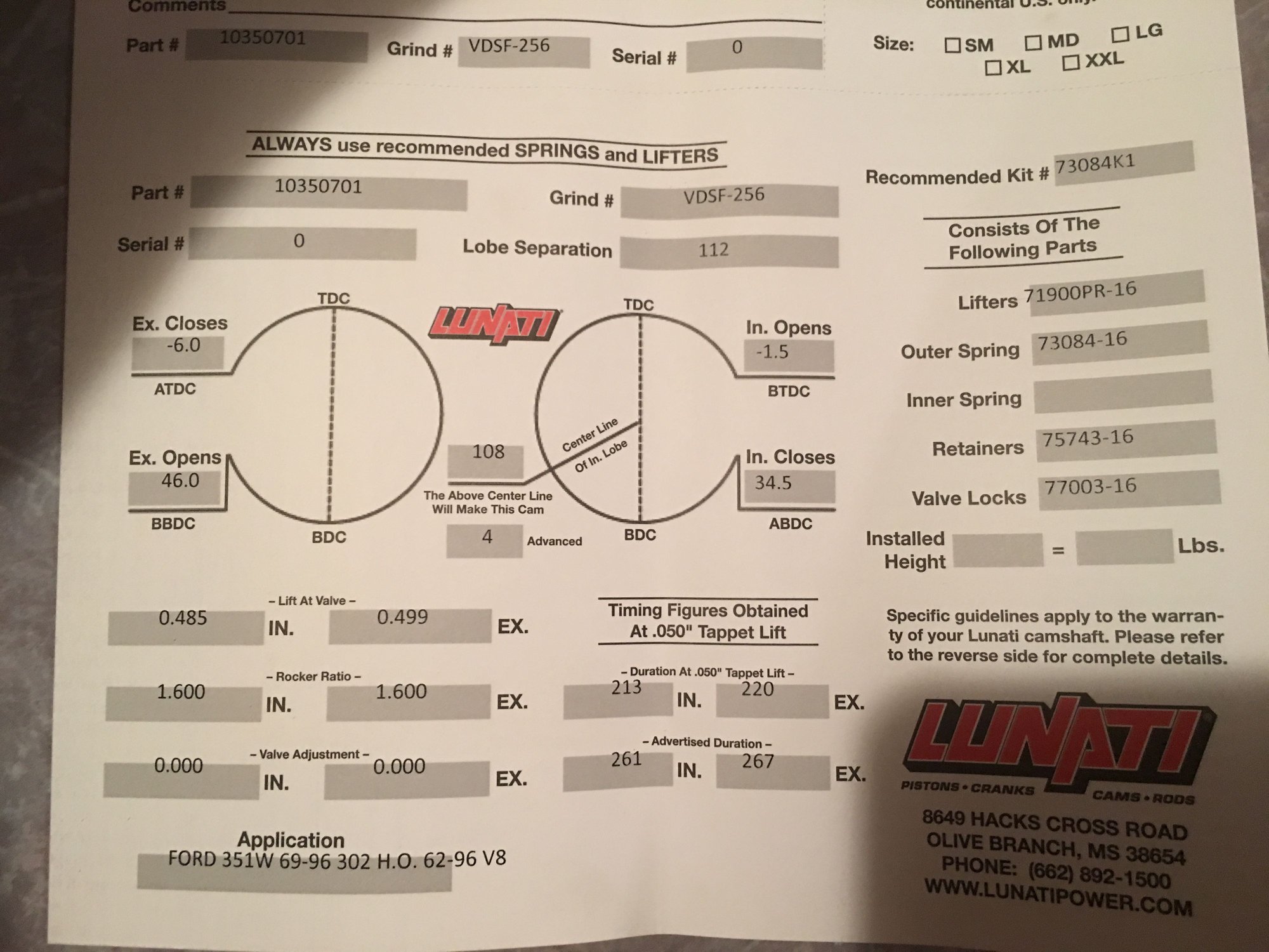 351W that was factory 2 barrel. Fully rebuilt and had to bore .040 over. Went with Lunati Voodoo tow/RV cam, spec sheet attached. That included new dual coil valve springs. Rest of valve train and heads are factory for 84' (note that heads are from 6,600 GVWR truck if it matters). Heads have 1.78 intake/1.48 exhaust valves, and I suspect 69cc chambers. I do have a lifter and valve train tap, which I suspect is clearance beyond spec. Running MSD 6AL with a factory Duraspark II distributor. Mechanical advance is already allowing too much advance. Base is set for 8° BTDC, lower mechanical arm setting is 16, which gives me 32° of mechanical advance, for a total of about 40°. Changed springs to bring my all in RPM from 3,200 to about 2,500, but stopped when I couldn’t get the total down. My best option to resolve the advance is aftermarket distributor, but all seem to lack vacuum advance, which I seem to really need with a manual transmission that is low geared and downshifting is not always best.