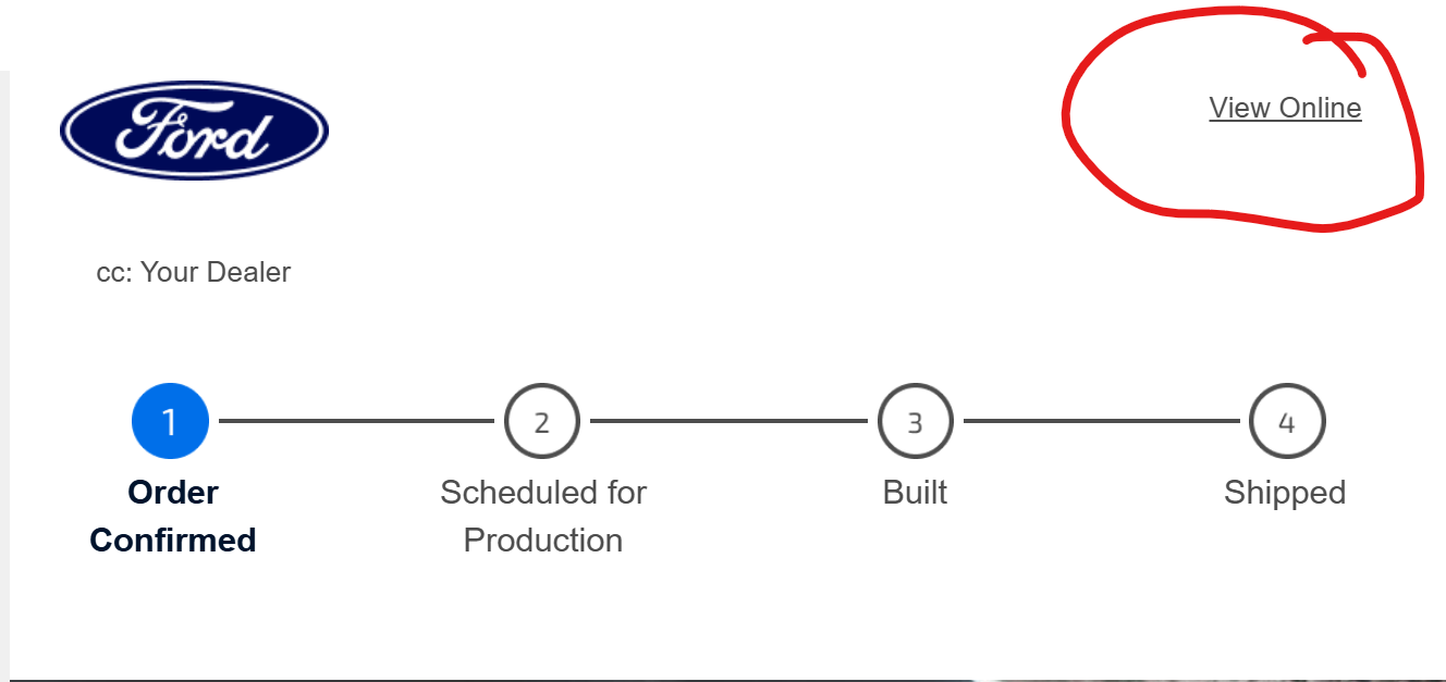 So I just clicked on the "View Online" link in my original email and it says the same thing as yours. That link just takes you to a static, online version/copy of your email. If you have Ford account, and it uses the same email address as you used for your order, you should be able to login to your Ford account and see a better/more real-time status of your order. And I'd be curious what "Step" it shows your order in, if you don't mind sharing. If you don't have a Ford account, you should create one using the same email address that you used on your order. Your new truck order should show up as an open order on your account, as would any parts you've previously ordered using that email address.