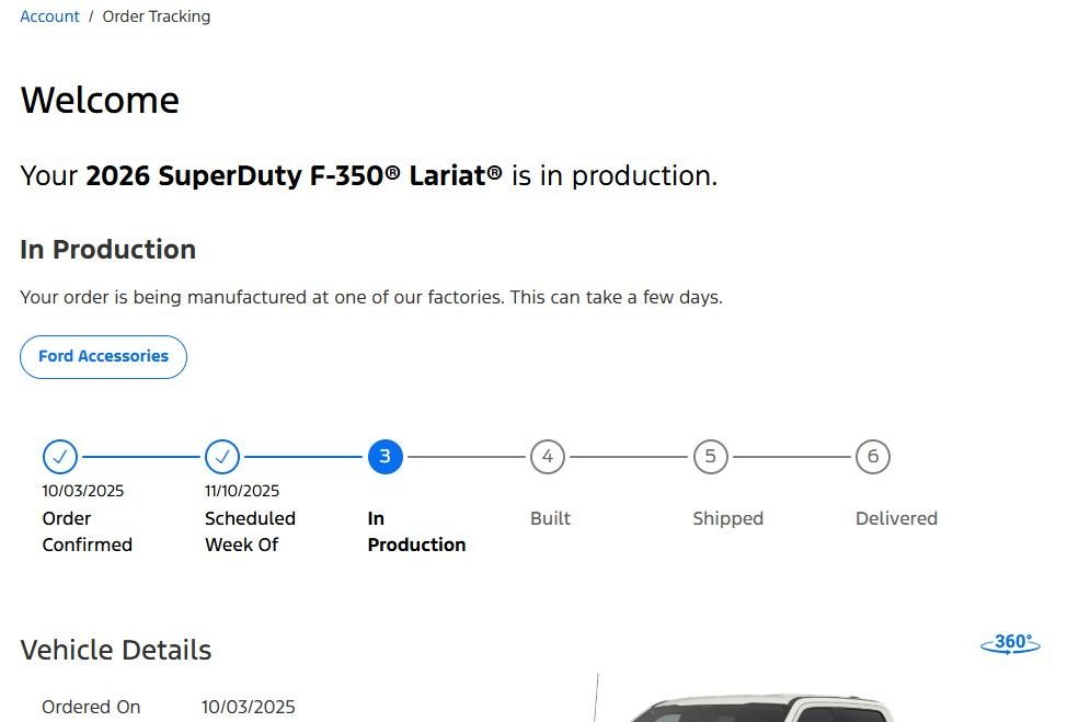 When I originally placed my order on 10/3/25, Ford gave me a Production week of 11/3/25 (today). But then, a week later, my Production week changed to 11/10/25 (next Monday). But I just checked this morning and now it's showing to be in Step 3 "In Production" of the process, even though the "Scheduled Week Of" still shows to be 11/10/25, which is next Monday.