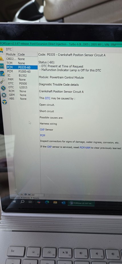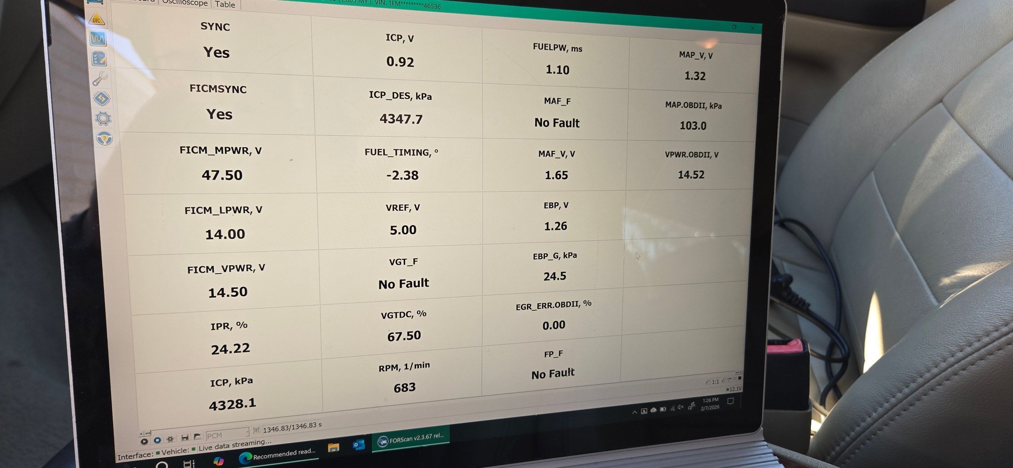 Unplugged the 1381c connector from the PCM, just to be safe also pulled the FICM relay, and did key off engine crank probing the Crankshaft Position Sensor pins and then the Camshaft Position Sensor pins. Both read correct hertz and AC voltage, perfectly in range of what I was told to look for and based on @bismic nice write up I found over on the Powerstroke forum. Was really scratching my head at this point and thought why not plug everything back in and try starting one more time. Put everything back in place and it fired up immediately. While it was running I pushed and pulled on all wires from the backside of the 1381c connector all the way across the engine, jiggling the CMP wires and the CKP wires. Idling smooth. I turned it off and restarted it. Turned it off and moved it in the driveway. Going for a test drive now. It is 44f today, will see if it starts tomorrow morning when its supposed to be in the low 20s. Here are screenshots of Forscan while it was running.
