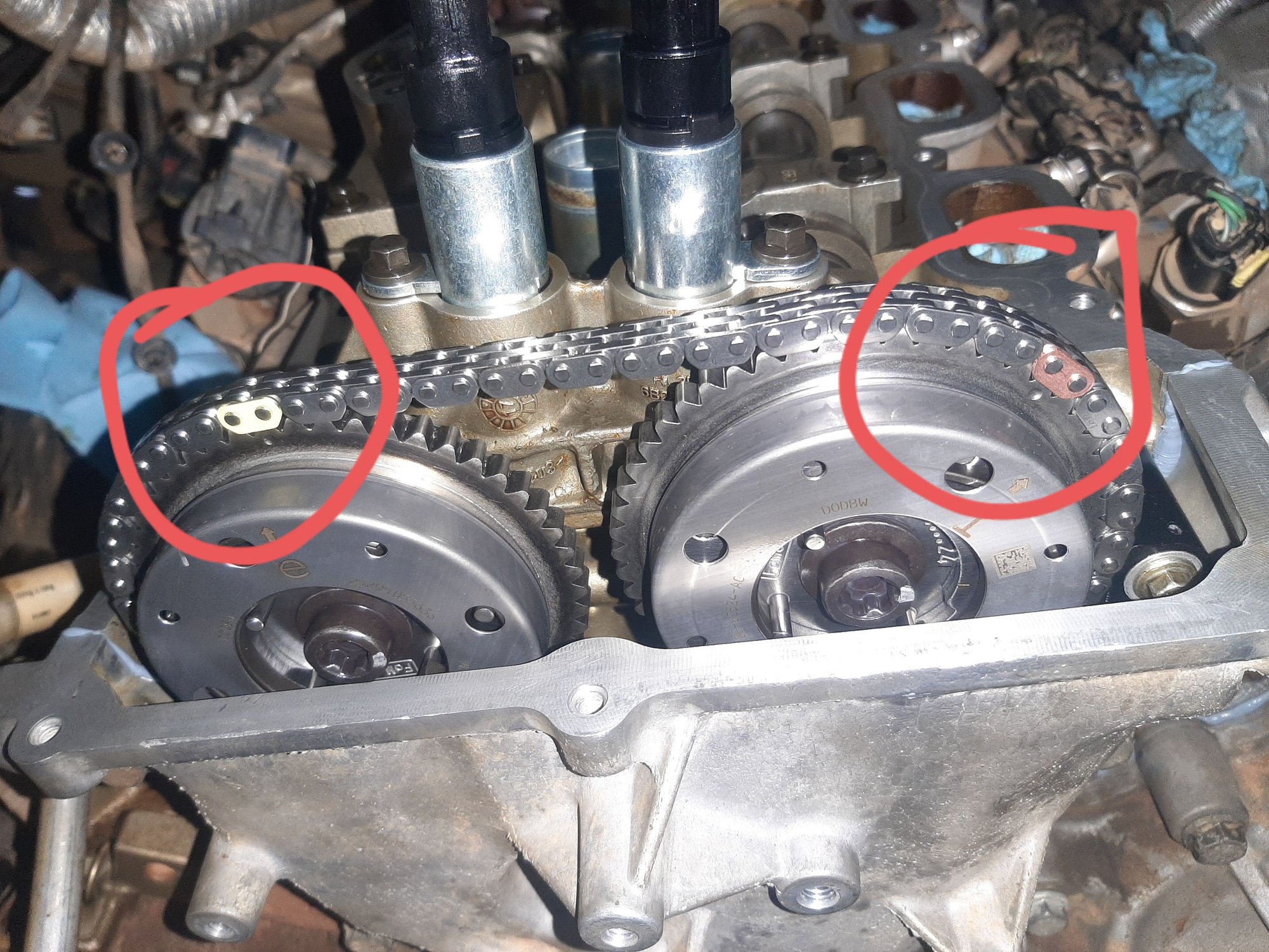 I Just walked in from putting the front cover on a 3.5EB 2018. Doing a complete timing job on it.... The double color mark split on the crank sprocket, and the other 2 color links on the intake and exaust timing marks.. OEM is the only way to go on this stuff with the updated vct's of course as well. Not fun doing it twice with aftermarket stuff.... Only thing I do thats not by the book is TA31 silicone.. Seems to last way longer then that 357 junk..