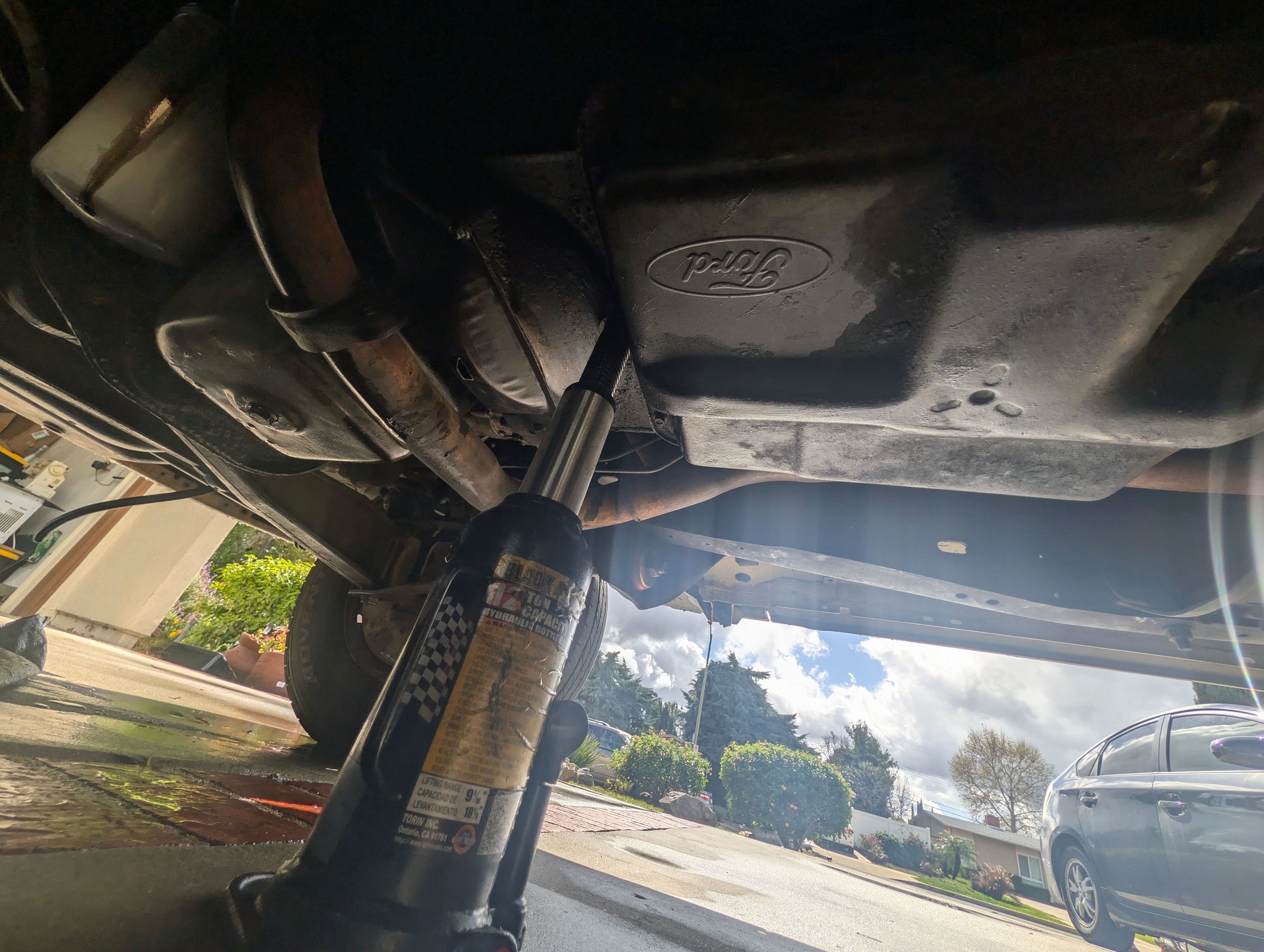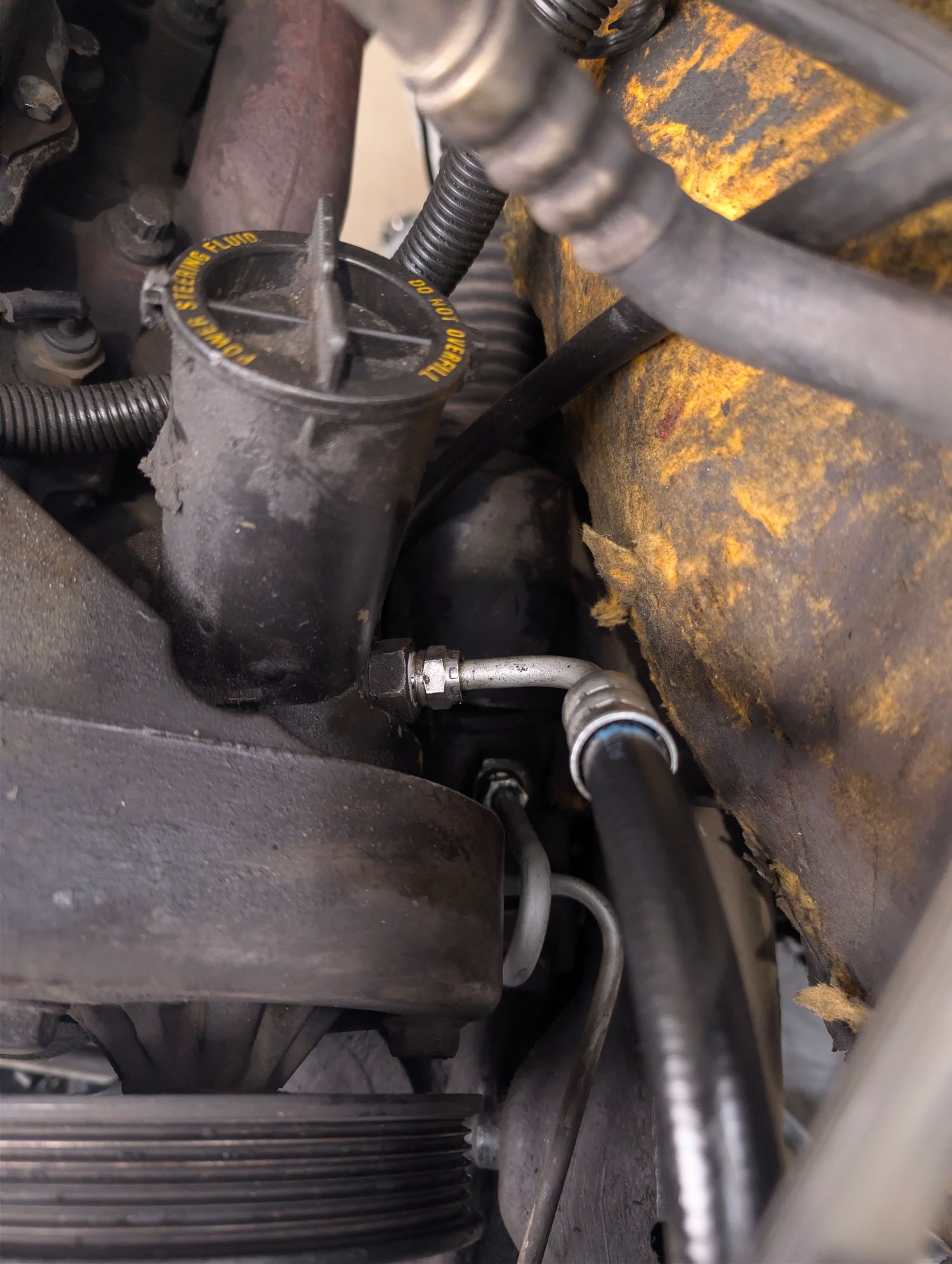 Looks like you're well on your way to me. With the trans crossmember still in, the trans cant roll on ya, so the bottle jack looks good. You can unhook ps hoses from either side, but at pump is best like you're planning, cus then the hoses can be tied up out of the way over on the truck side.