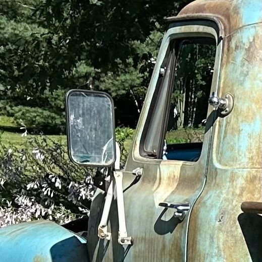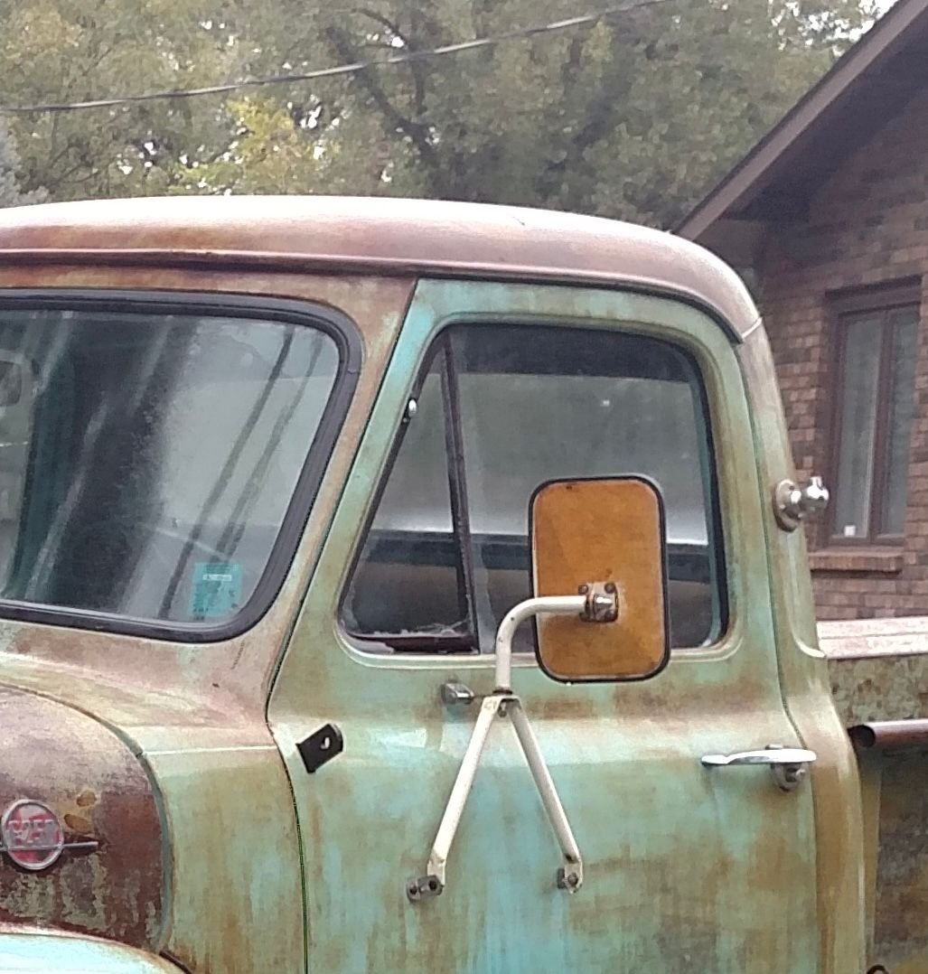 I have new chrome mirrors with the original mounts in place. I was trying to avoid having to weather them. The trick is getting the rust to bleed into the paint as well as create that speckled pitted rust pop through the paint look as opposed to just patches of rust. The cream colored paint should be easy to duplicate.