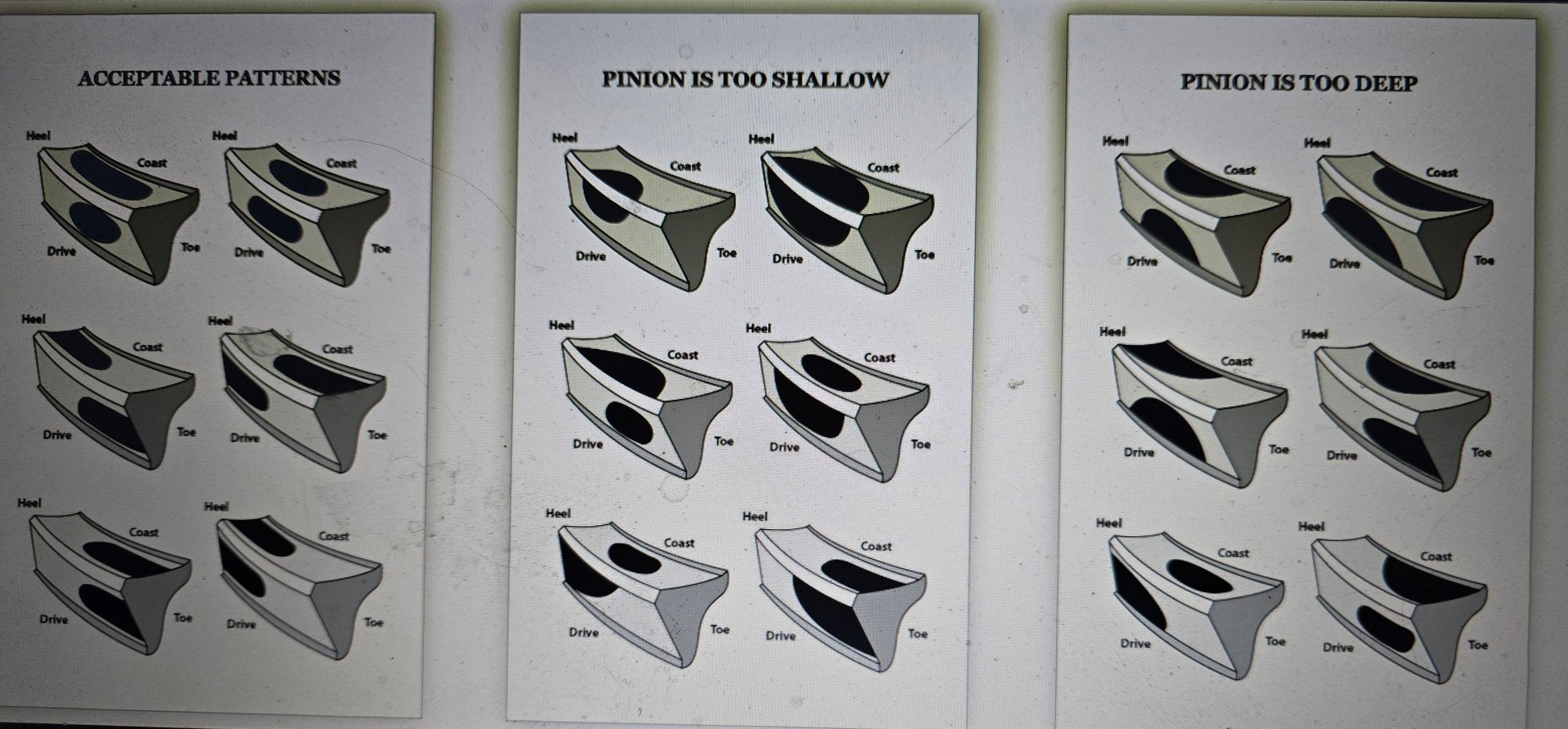 Back lash is spot on. I started with the .005 shim that was on the original pinion. New Motive gear ring and pinion. I have too increase the depth on the pinion. Can you tell be the pattern, or figure out what too increase the depth by. I was thinking to double the size of the current shim would get me close.