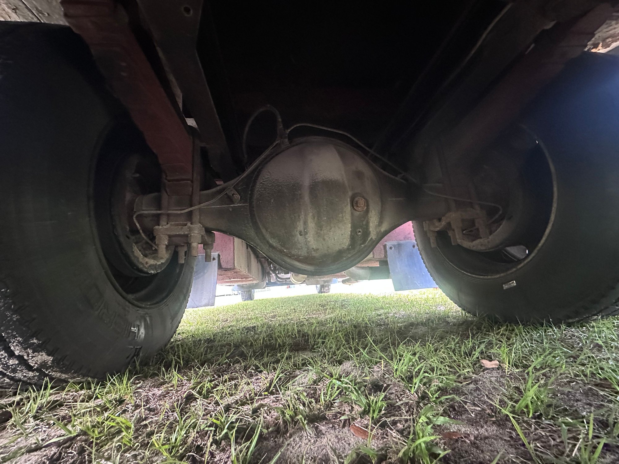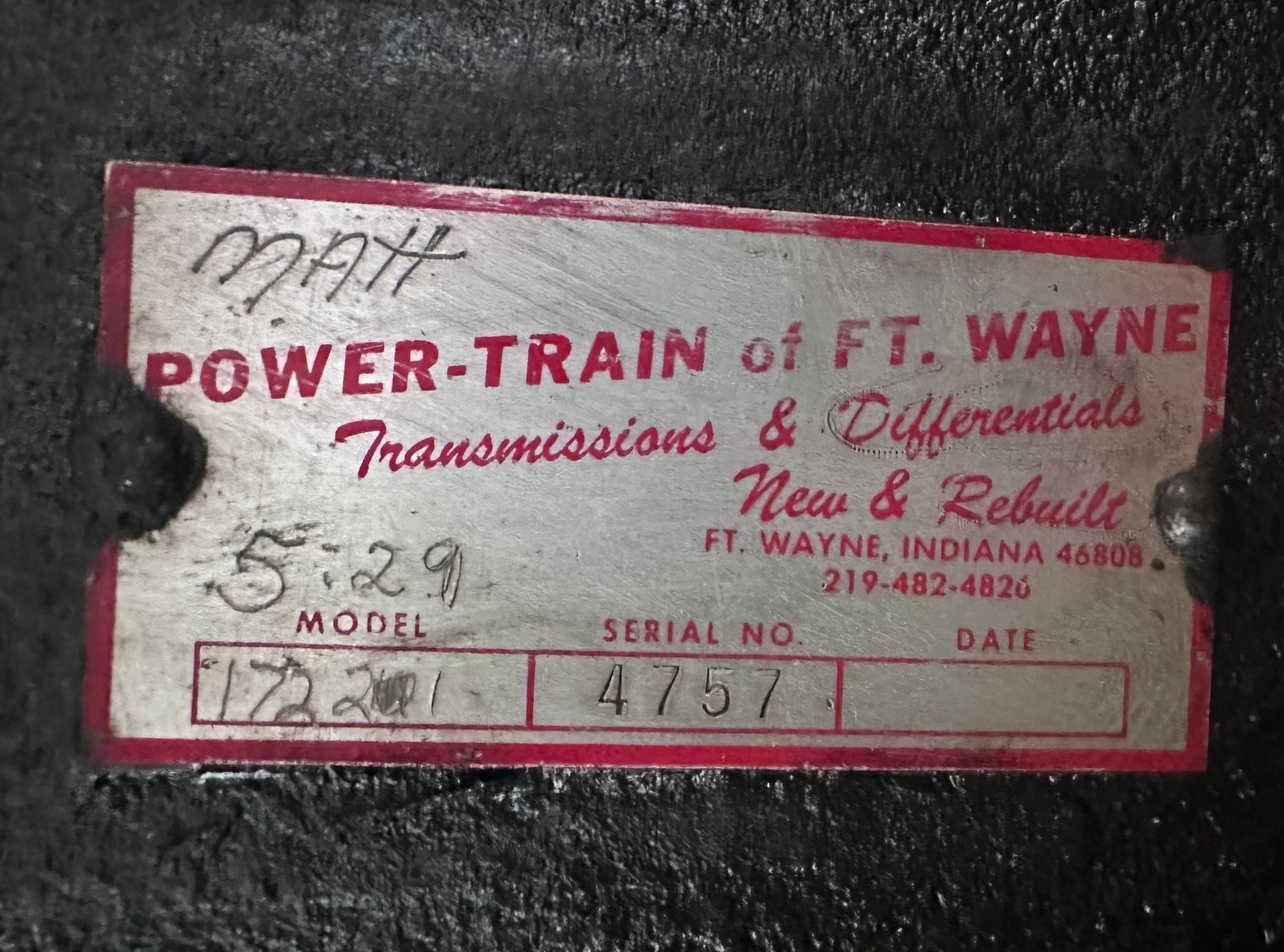 no air brakes it has vacuum booster with some form of storage tank under the cab ? Never seen that before . Rear end has a tag from a truck shop with 5.29 scratched into it . That adds up on my gearing calculator when i put in direct drive to 5.29 with 40” tires . It still has the functioning 2 speed in it .