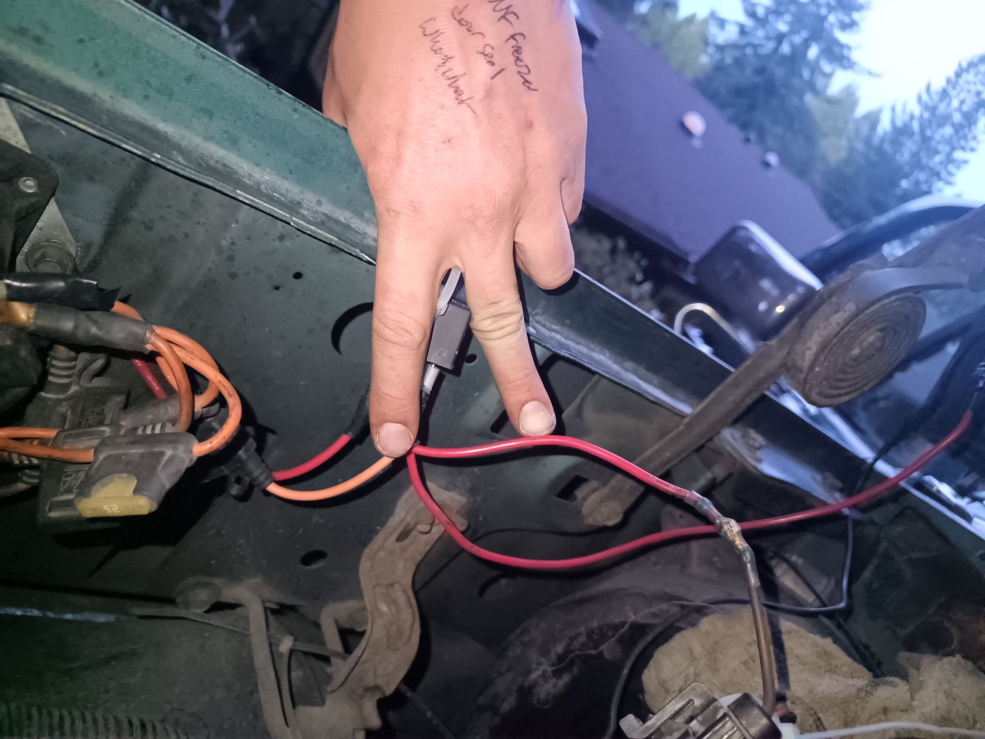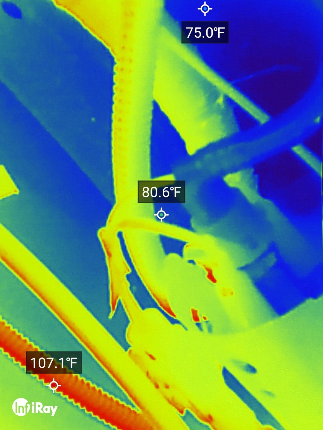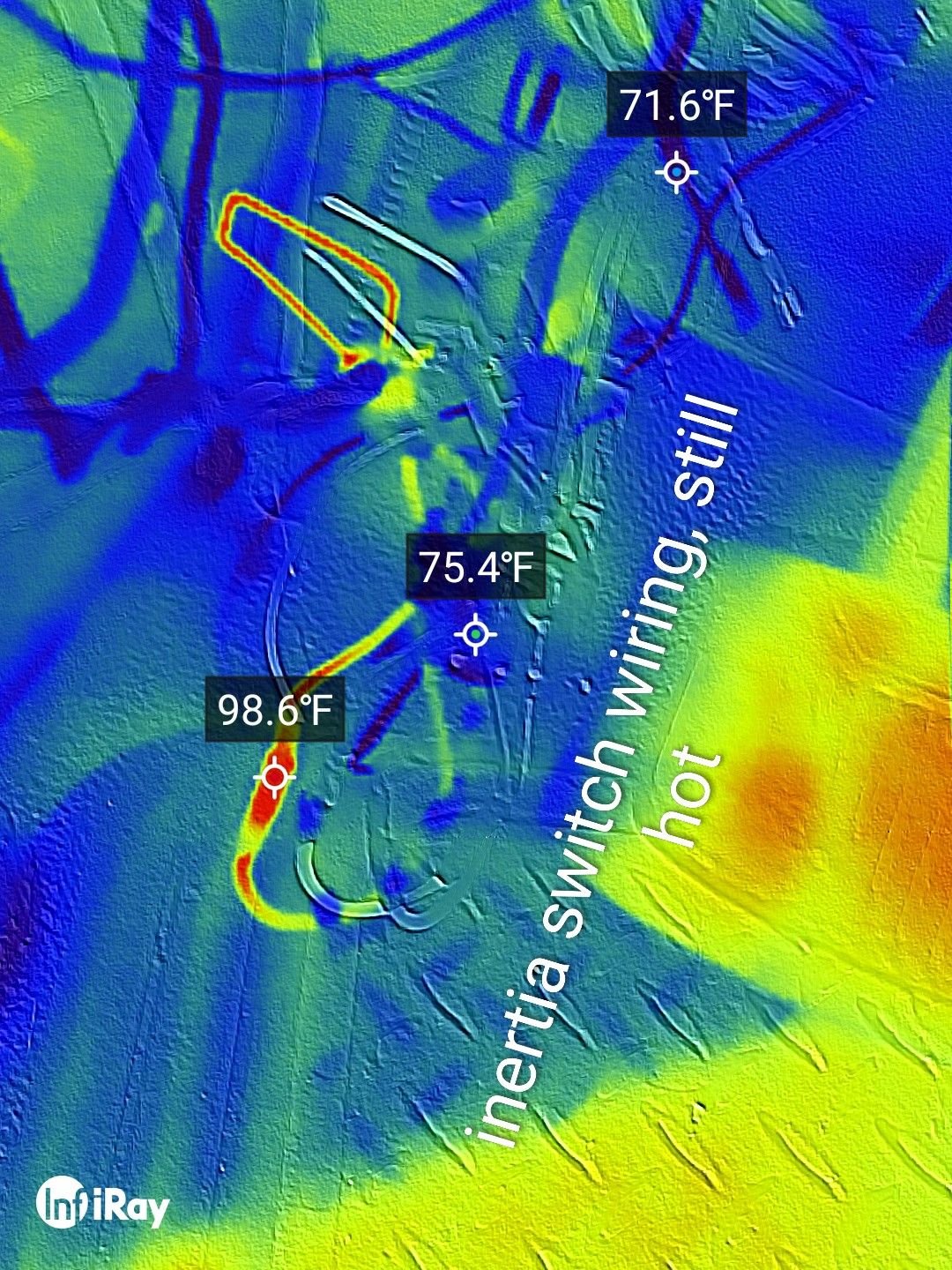 I forgot to note, A while ago I had used a I used an inertia switch from my '91 F250 and still the wires got hot. Today i used a paperclip to bypass the switch and the wires still got hot, but the thermal camera showed one wire heating up before the other, at the point of the butt connector. So I shortened the wire eliminating two splices, used solder butt connectors on each wire under the inertia switch, and STILL it gets hot.