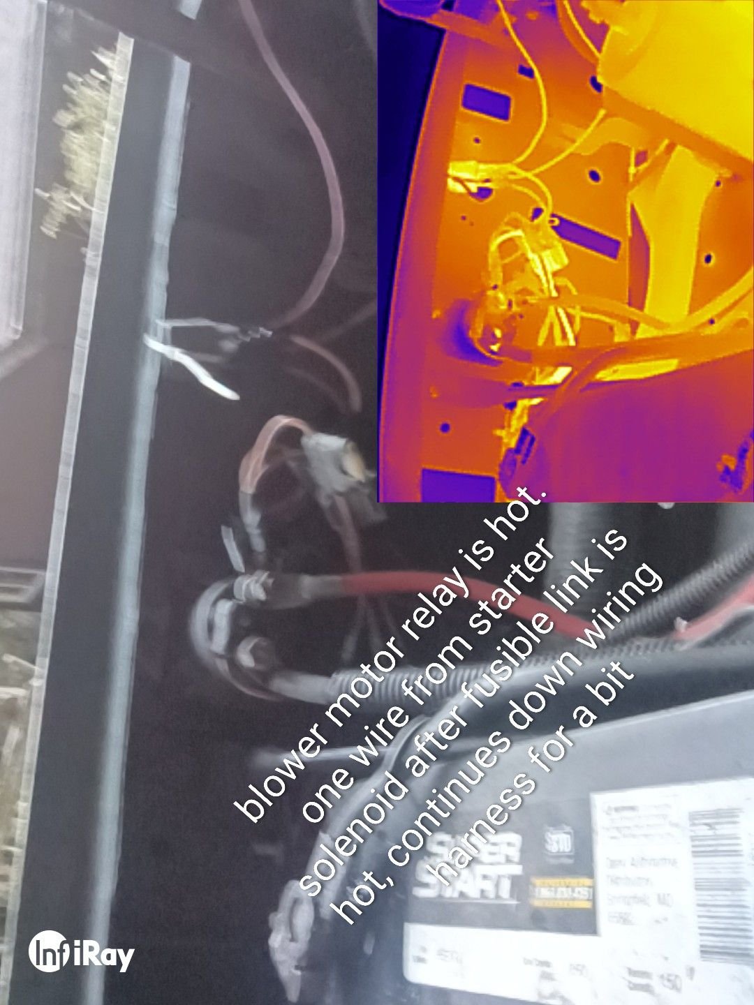 Then a co-worker suggested maybe that wire is warm because it is carrying voltage(current). So I checked the battery under the hood which was cold comparitively. At that time I noticed the blower motor relay I put in was very warm. Loose butt splice so I replaced it with a solder butt connector and it solved that one wire being warm,.BUT there is one wire going to the starter solenoid that gets hot after the fusible link and before the solenoid