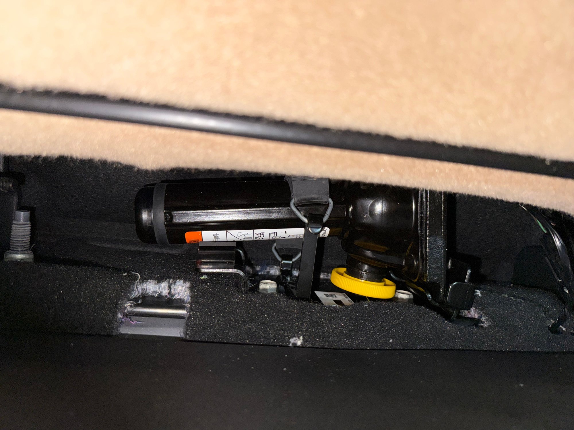 So on the edge of the seat back, you'll see a cloth loop, similar to the one that lets you lower the seat bottom back down if you raise it all the way. Give that a yank, the seat back will fold forward, and you can reach the jack easily.