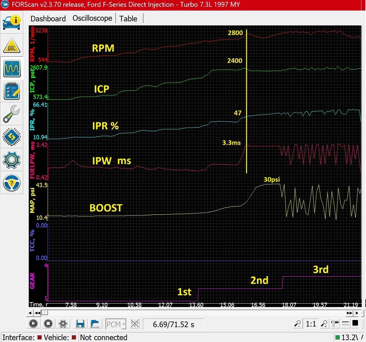 Got a bunch of new stuff in the truck and know I need an HPOP soon but want to troubleshoot the problem and see the failure in the data, rather than just throw parts at it. Pic below is a 2-3 gear pull and as soon as the truck hits 3rd, it falls on it's face. I'm new to diesels but it feels like an LS motor bouncing off the rev limiter. Power comes in and out and in and out, etc.... about 5 times a second.