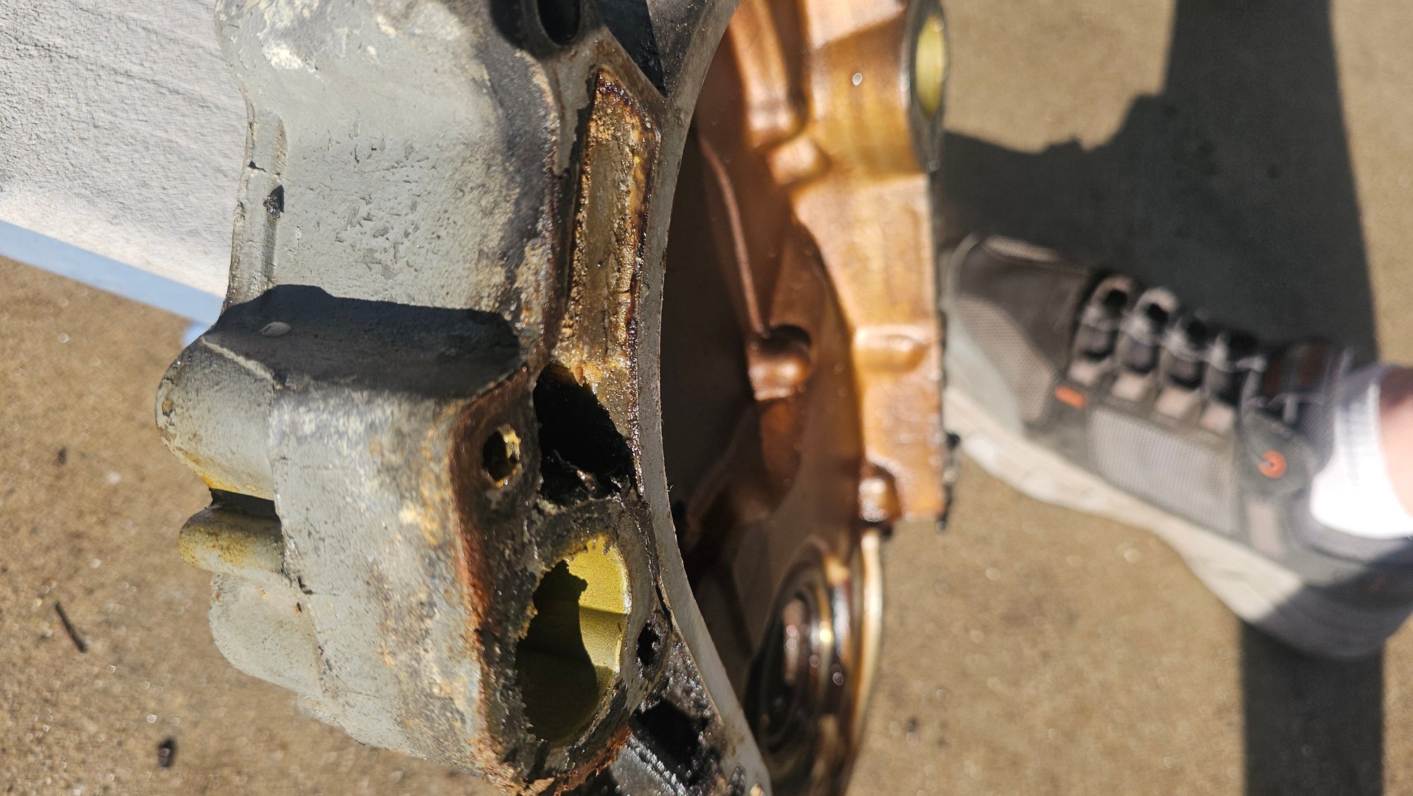 Cover has no pitting. I do see where coolant was getting into this chamber above the coolant passage, Seems likes its supposed to stay dry. There is a drain channel it appears but it was blocked by sealant, so if coolant got in there I can see where it may blow thought the gasket. Overall quite a crazy design. I spent 30 minutes trying to get the old gasket off and I'm maybe 10% done. Not many mechanics would take the time, I have to use a steel razor blade? anything that will soften up this 35 year old smashed and cooked gasket? and an ugly position to work on it...I'm using a 2 step hot tub step set and a foam pad against the bumper so my shins dont get bruised to much.