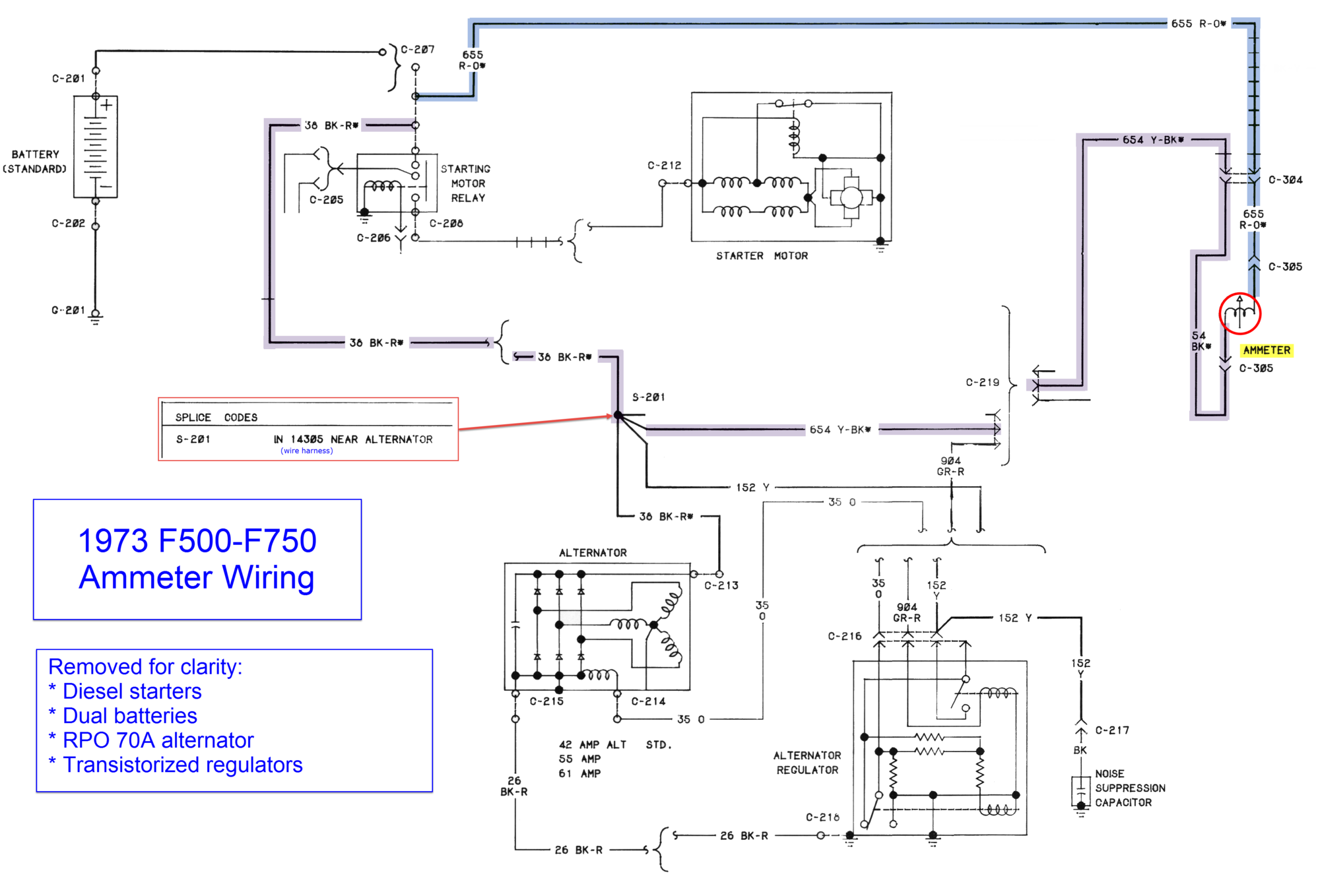 The section of circuit 36 from S-201 to C-213 isn't optional but has the asterisk (for all alternators). Also, I don't think that the ammeter was optional for these medium-duty trucks; the standard instrumentation has the four basics: oil pressure, ammeter, fuel level, and engine temperature: