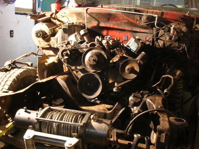 What were your frame brackets off of for the motor mounts to bolt to? I have been doing a 390 swap into a 90 pickup for a while now and used the frame brackets off of a 75 that the 390 came out of but my motor sits down in my frame a little more than yours by the looks of it. And my motor mount brackets look totally different than what yours do. I'm just curious because with my motor in my truck i would have to cut a huge hole in my frame to even be able to fit an oil filter on the motor. I was just planning on putting a remote mount oil filter on mine. But i'm curious what your brackets came off of?