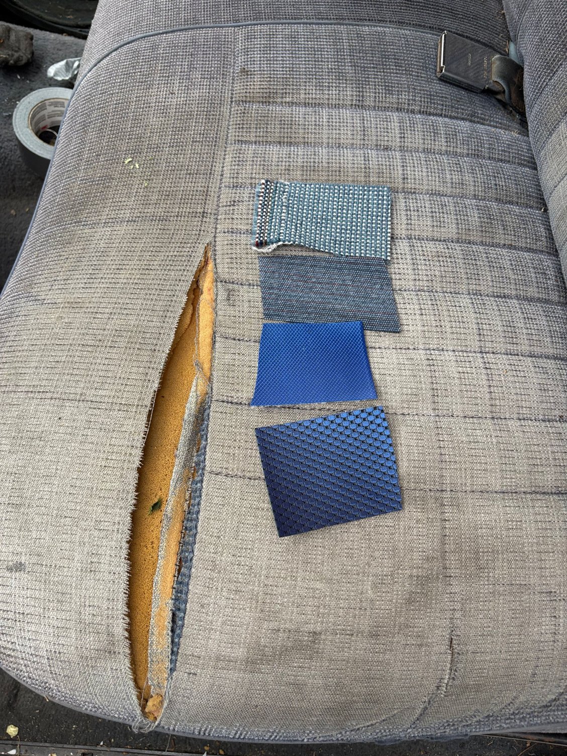 I have some fabric samples that I got from a supplier in MN. One is a close match to the OE fabric... another just a bit different. Plus I got two solid color samples just to see how they look.
