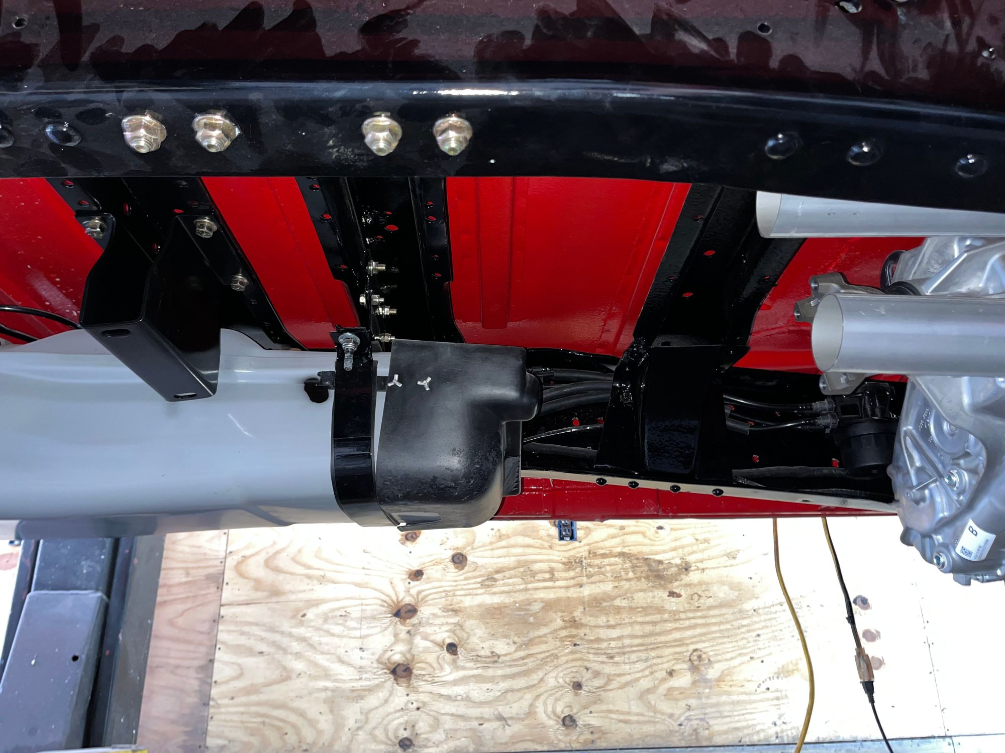 For the rest of the box attaching bolts, I utilized the factory holes again and made nice receiving perch brackets welded direct to the upper side of the chassis rails and attachment is made with thru-bolts and nylock nuts.