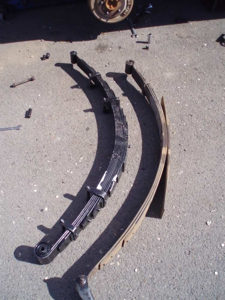 This is the stock spring pack (right) vs. the new pack (left). More leaves means that less leaf has to hold more weight, which makes it more flexible, which makes more flex. And its got a real nice ride to boot!
