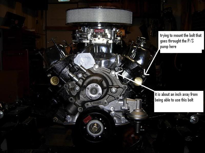 I looked throught the barn last night, but the engine I've got out there has already got the brackets off of it. cmoritz has pinpointed your problem, though. The air conditioner bracket is a big L-shaped cast iron monster that bolted to the front of the head and water pump. I haven't played with an engine with this bracket design in 10 years or so, but I roughly remember how it was assembled. If memory serves, the A/C mount had a drilled and tapped hole that the power steering bracket bolted to. I poked around the internet and eBay to try to find a picture, but the A/C compressor and fan shroud obscures the power steering pump and brackets in all the pictures I found. My advice would be to go poke through the salvage yard and see how it is supposed to be put together. You've probably got the right bracket, but not all the associated parts.