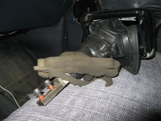 I pulled the rubber boot inside out and pulled these 2 bolts. On mine, they were 10mm.