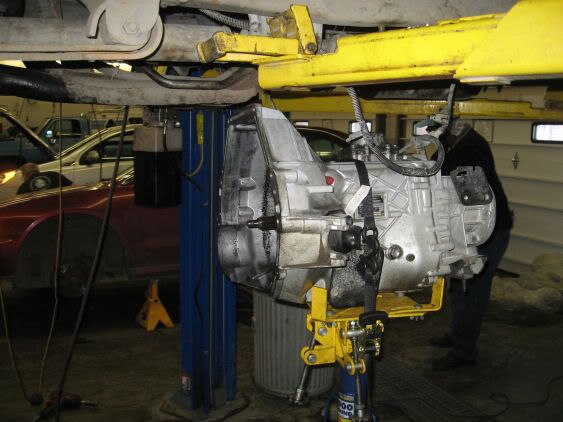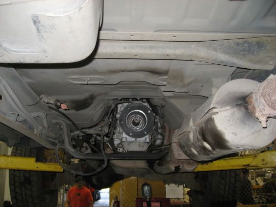 When everything is clear, pull the trans strait back with a few wiggles, and mind the exhaust, fuel lines, and all the other junk in the close vicinity.