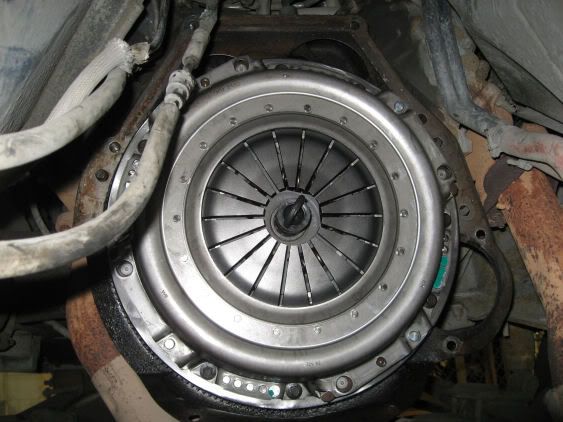 Here's the new clutch kit installed. That little plastic thing goes into the pilot bearing and holds the friction plate on and centered so you can get the pressure plate on.