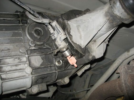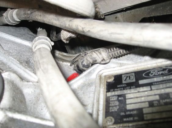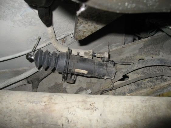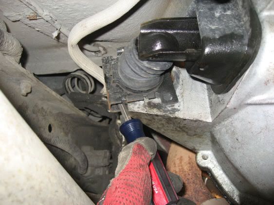 This is one of the things I'm not extremely comfortable with, the slave cylinder just slides off of that little ear on the trans. Eye protection is reccomended at this point, if you're not already wearing it while working under a truck - when the rod comes out of the dent in the shift fork dirt can fly off at you. Pry it off with a screwdriver, it comes off easily.