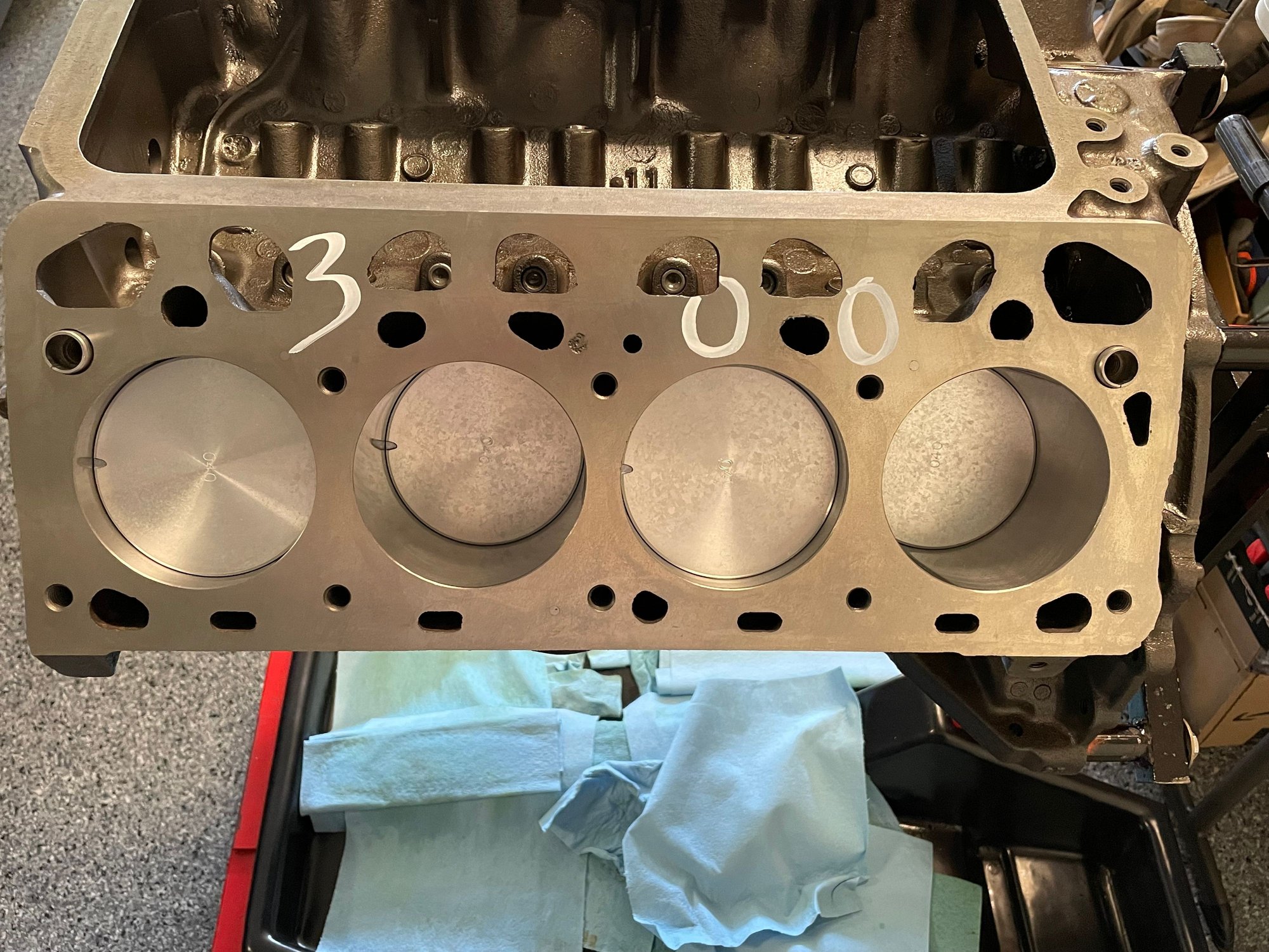 -Engine block cleaned, peened, magnafluxed, and machined. No unforeseen issues with any of the original re-use components and all bearing, thrust, gap clearances were perfect.