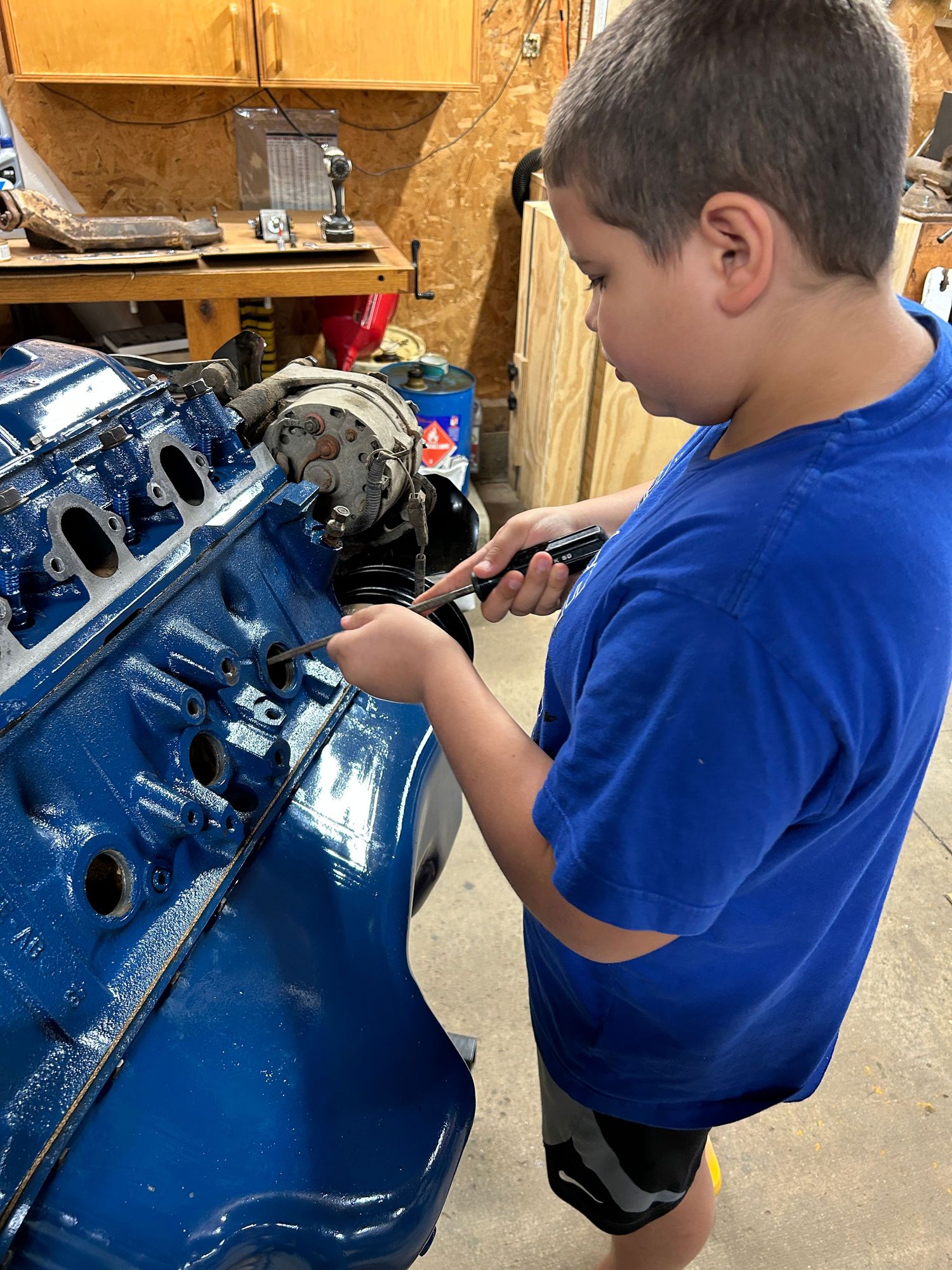 But of course, the first one he did, he knocked it clear into the block and I had to dig it out. There’s nothing like learning when you make a mistake, but this was an easy one to correct and he did the others perfect. So then after we got those out, we were scraping the crud that was right around him cleaning the holes out getting them ready for the new ones and then his friends came by and he decided he wanted to go play.