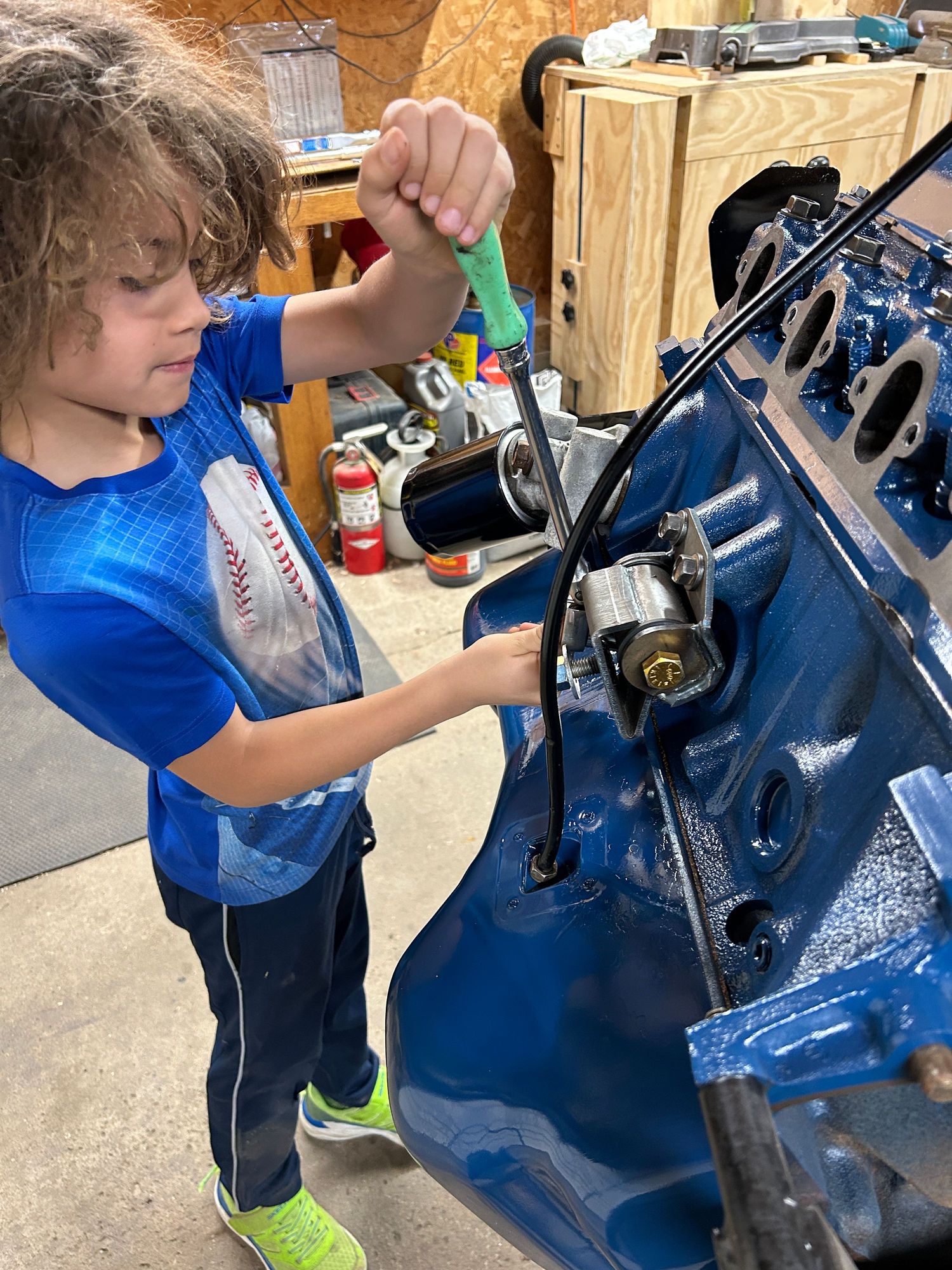 So we jumped to the other side I took the manifold back off and then cracked the motor bounce loose and then let him take them off. He’s still at that age where he really likes to do the ratchet and then I handed him the hammer and I held the center punchand let him knock the freeze plugs out of this side. Yes, under my breath I was praying he didn’t slip off and hit my hand, but he did great of course he knocked one into the block also and we had to dig it out, but he thought it was fun getting