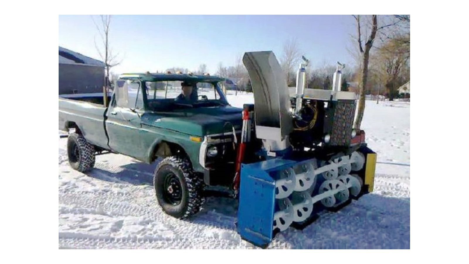 So you've got a F-250 or F-350 without a power take off to run a snow blower? Well, why not strap on this snow blower unit with its own 302 Ford V8, battery, and fuel supply? You probably don't need the 300 or so horsepower that motor can put out just to move the snow, but a 4-cylinder just wouldn't sound the same bellowing through those stacks. This came up for sale a few years ago out of Wisconsin, where they know a lot about snow, and BangShift was good enough to grab the whole ad and the pictures and post them here. The 1977 F-350 it was attached to was not for sale.
