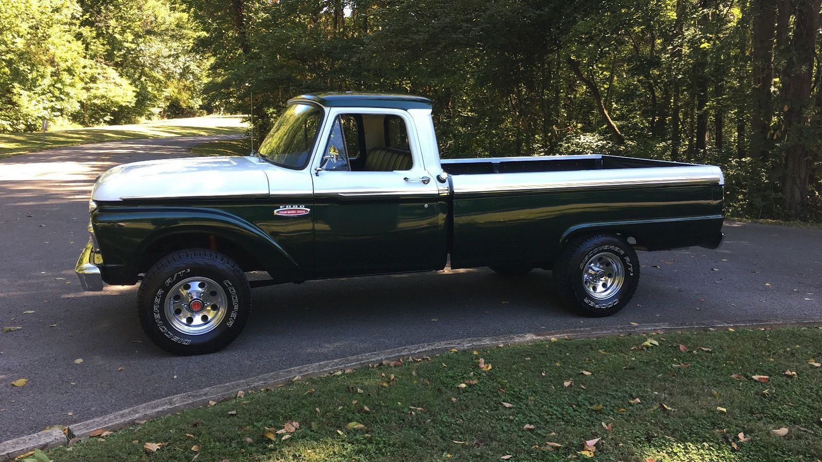 This super clean 1965 F-100 is a perfect canvas for its Holly Green and white two tone paint. Depending on which angle you view it at, the paint almost appears to be black. The converted (not original) four wheel drive also has a nice set of complimentary rolling stock - American Racing wheels with Cooper tires mounted on them. The restoration is topped off with a nicely refurbished interior and a rebuilt 352.