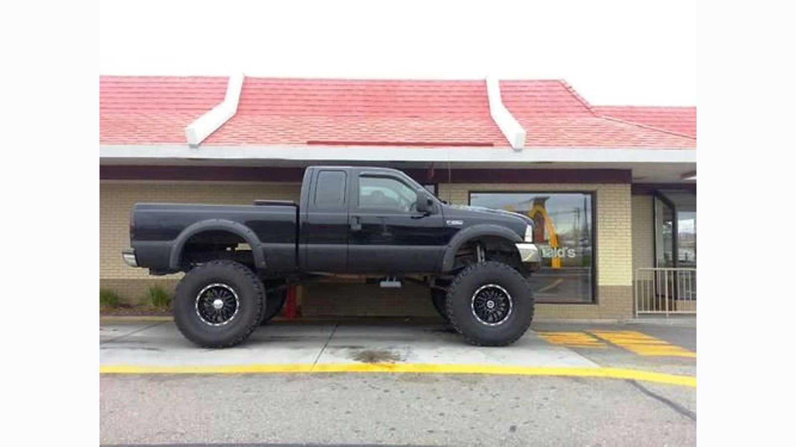 In America you have the freedom to drive a modified truck if you want to, but some of these fast food places discriminate against lifted trucks as if this were China. Don't believe me? How come they close the main restaurant late at night? And how come they don't allow walk up customers at the drive-thru window? The owner of this truck is damn lucky, because it looks like he fits with maybe 2" to spare, but he may be leaving with the low clearance sign stuck to his roof.