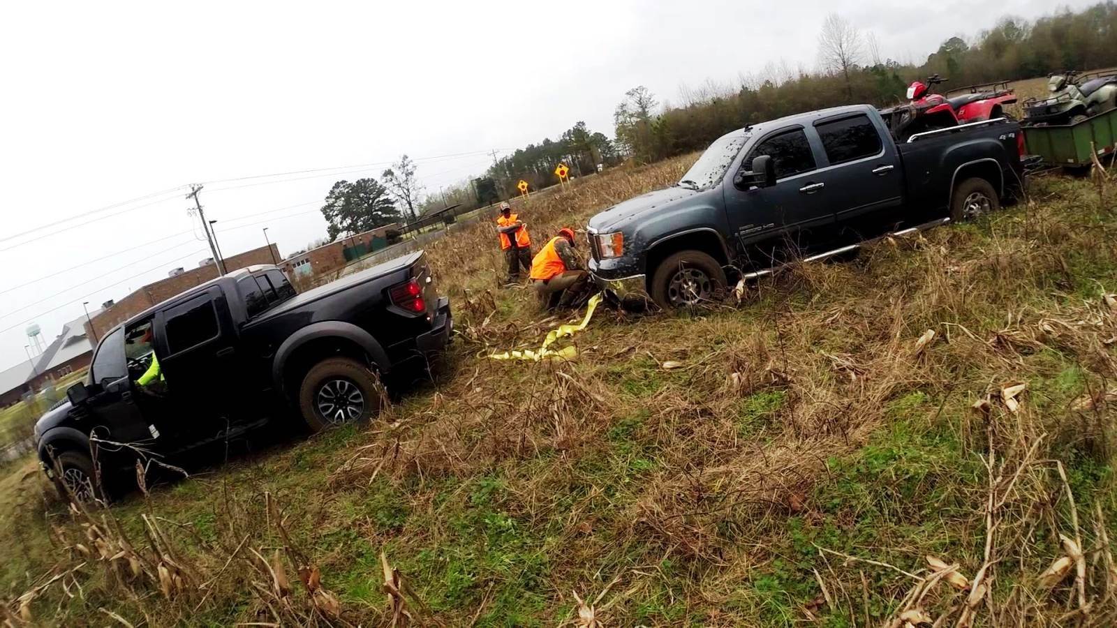If you live in a rural area or somewhere prone to snow drifts, eventually, people are goign to ask you to pull their weak little car out of trouble. Or, in the case of the picture above, get their GMC 2500HD and trailer out of the mud. As a guy who owns a truck, how can you say no to someone in distress like that? You can't, and because of that you ought to keep a snatch strap in the cab behind the seat just in case.