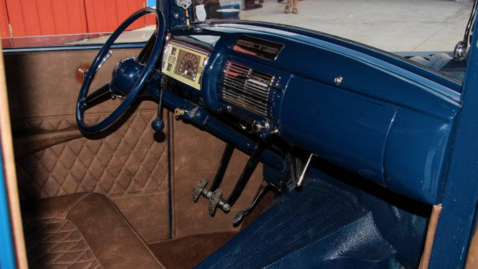 Much like the exterior, the interior of this old Ford/Mercury is an exercise in tasteful simplicity. The bench seat and door panels are covered in tan leather, while a metal body-colored dash holds a 1940 Ford instrument panel and steering wheel.