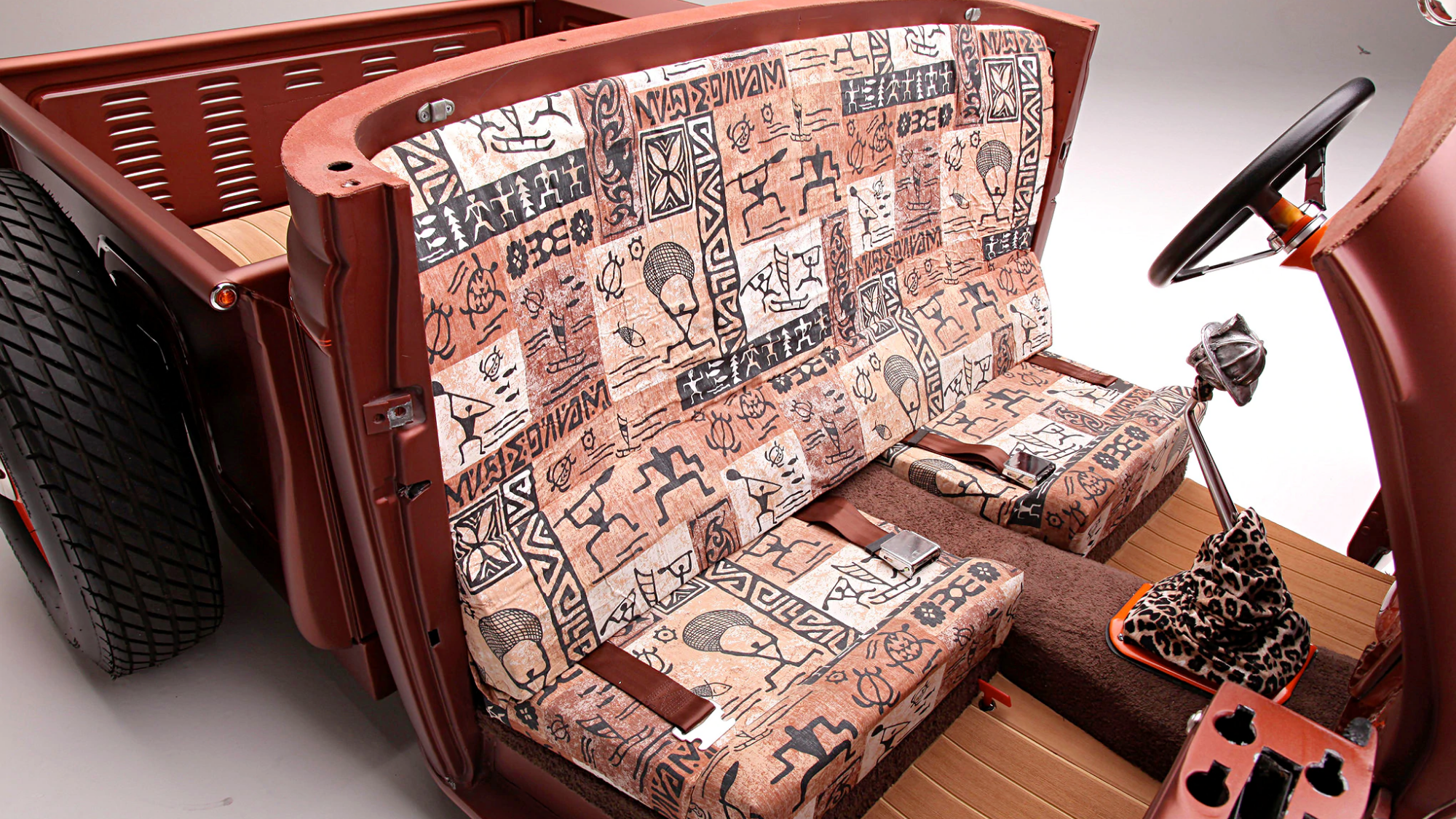 This old horse buggy turned hybrid surf rod was finished in a satin burnt copper with contrasting orange and outfitted with Firestone bias blackwalls from Coker Tire. The interior features a Tahitian print-covered, scratch built split bench seat and pinup-airbrushed door panels and wood panel–looking carpet.