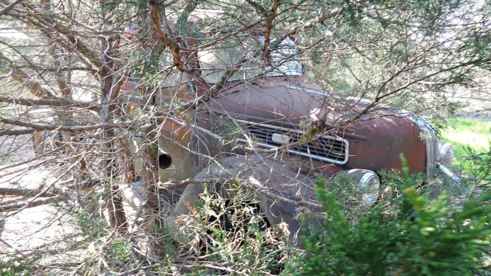 According to Ehrlich, this old Ford had been sitting in the woods for decades, to the point where it was surrounded by seriously heavy brush and hidden from view. Somehow, however, the truck held up surprisingly well over those years, though Ehrlich needed a chainsaw and an excavator to free it from its long-term home, as trees had already grown up through the frame.
