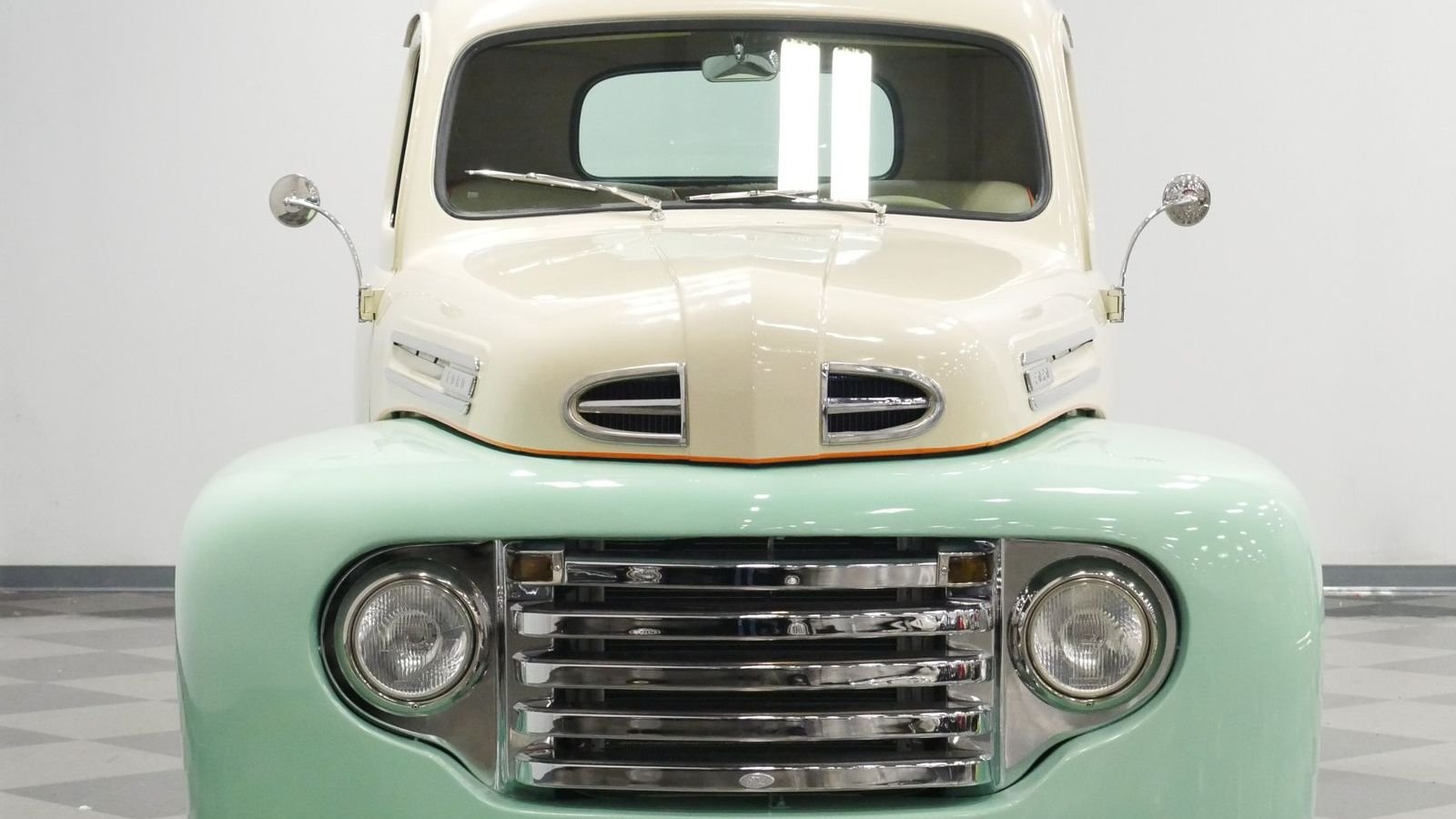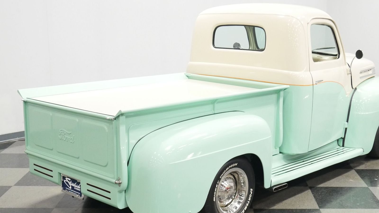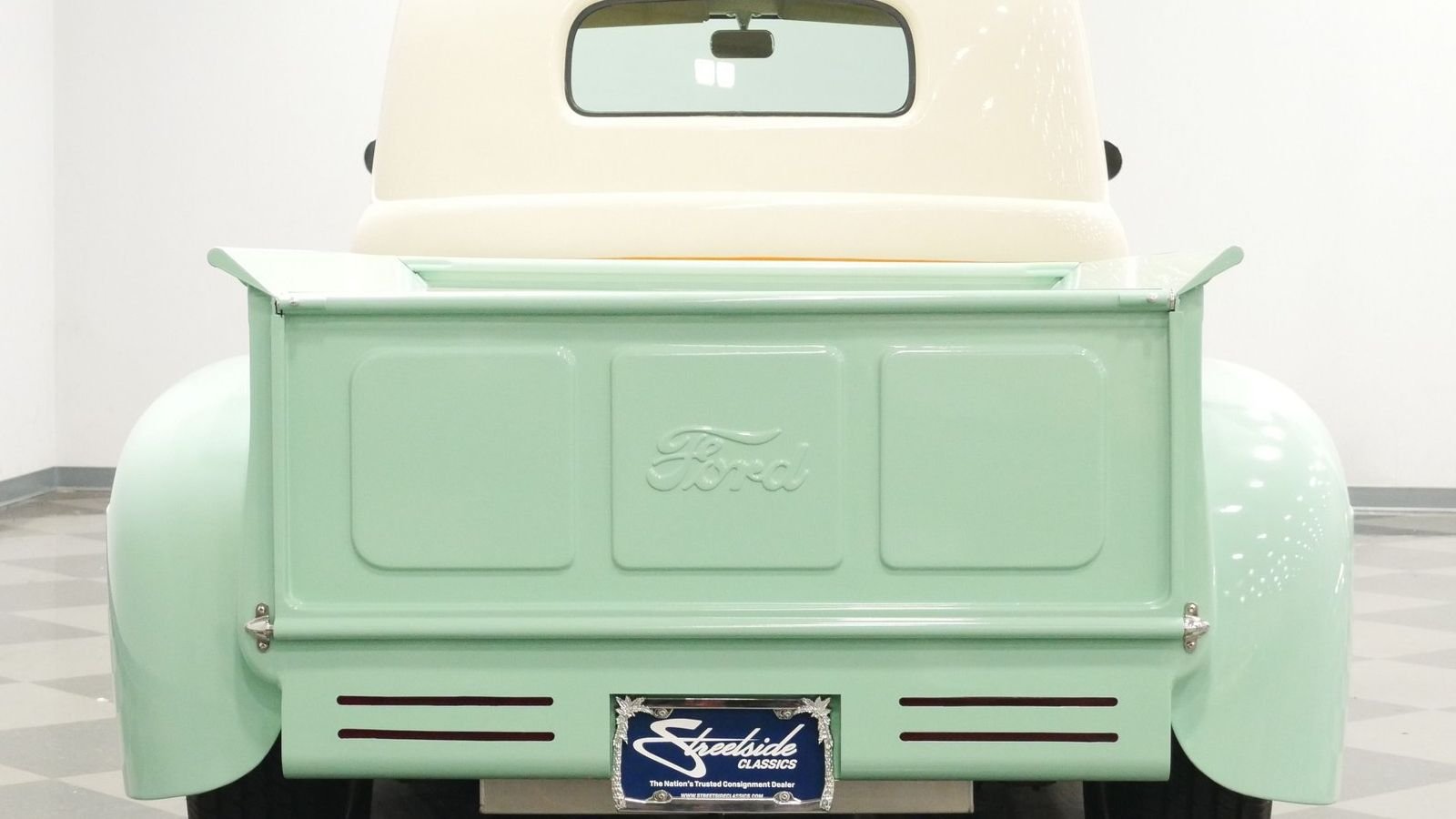 The 1949 F-Series edition debuted a cab that was much wider than previous Ford truck builds, which was a change welcomed by drivers nationwide. This restoration's reimagined interior does a tremendous job incorporating the truck's exterior look throughout. Orange seams unite the cream bench seat with a fold-down armrest, while seafoam green accents echo the car's exterior color. It's proof that no detail was left unexamined during this truck's frame-off restoration.