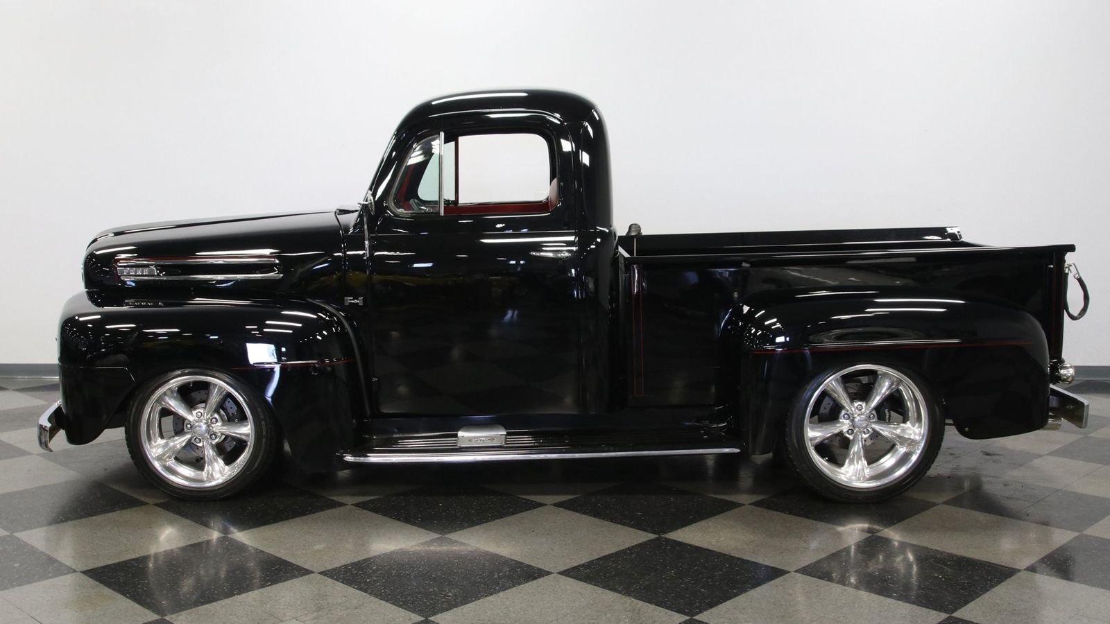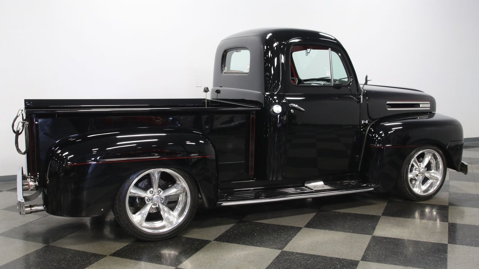 As can be judged by the photos, the body has gone through an extensive restoration to perfect the beautiful lines of the F-1. And the shiny black paint shows that off nicely. Lowering trucks to the ground isn't everyone's cup of tea. But the suspension underneath this restomod has been built with a tastefully adjusted ride height that doesn't diminish the character of the old truck.